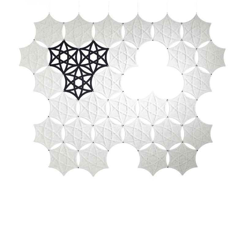 Formen er bygget op omkring en heksagon i et antal farver og mønstre. Enkelt og fleksibelt system, hvor du kan lave dine egne geometriske mønstre. Airflake fastgøres til en aluminiumsskinne, som kan fastgøres til væg eller loft. Den kan også skrues direkte på væggen.