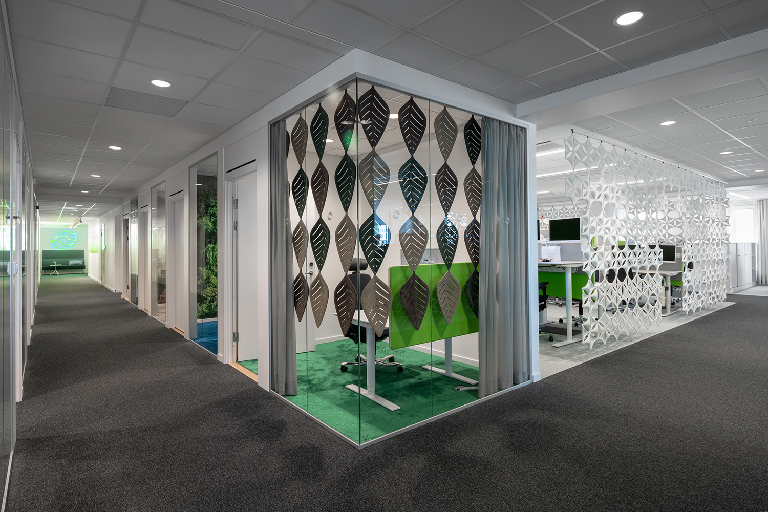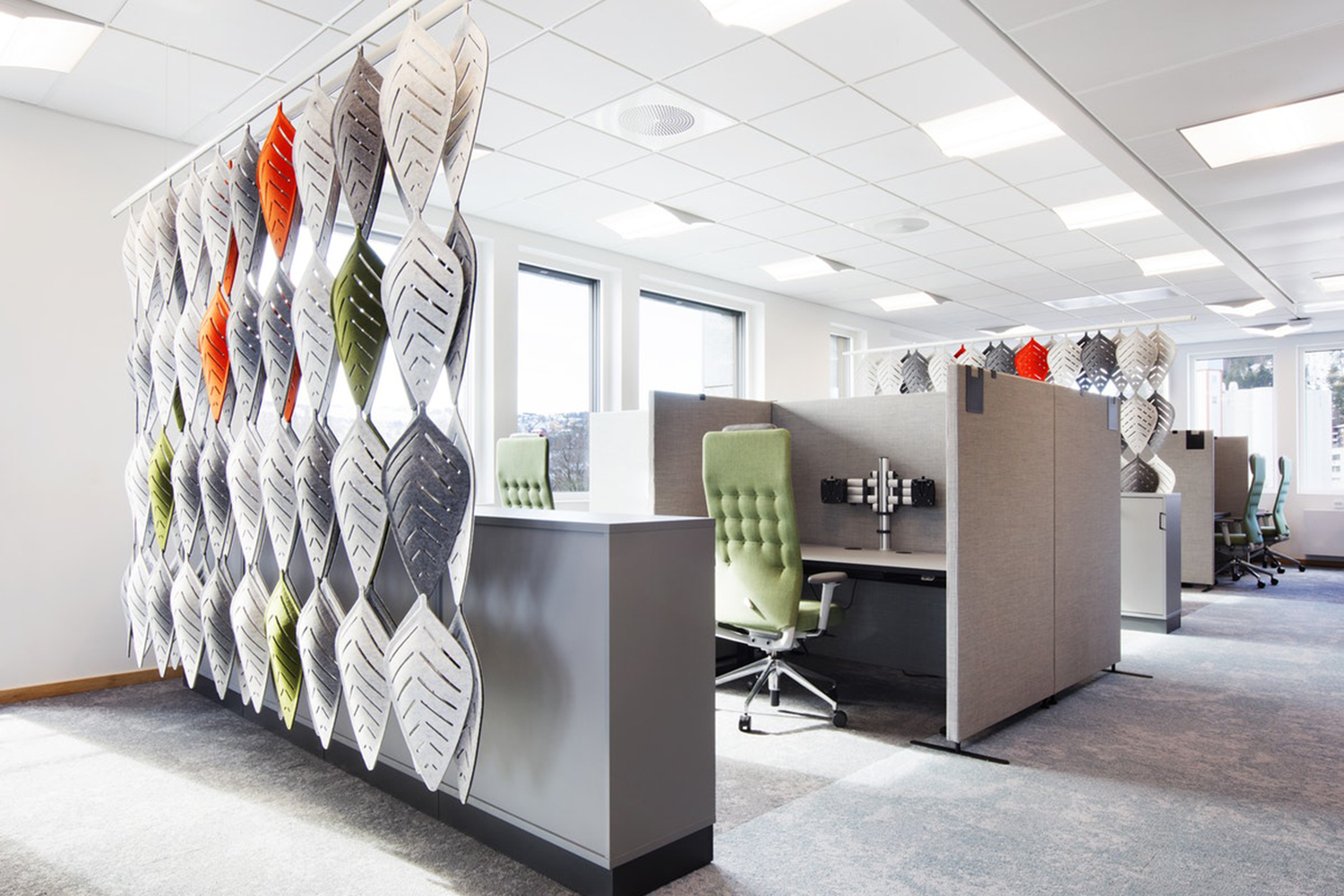Airleaf gør det muligt at skabe separate områder med behagelig akustik, mens rummets åbenhed bevares. Du bestemmer selv graden af åbenhed alt efter hvordan de bladformede moduler kombineres i forskellige mønstre og formater.
