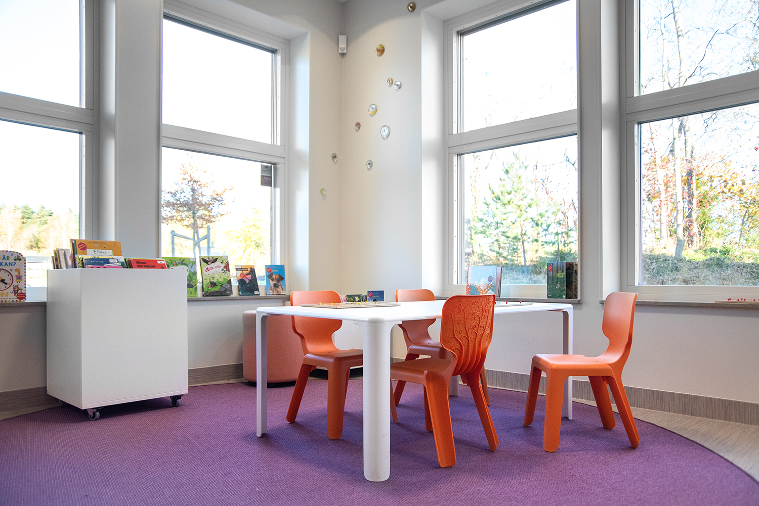Idé og funktion i skøn forening. Udover at give stolen stabilitet er det med til at give stolen et kreativt og muntert udseende. Farverne repræsenterer de forskellige årstider: grønt for foråret, orange for sommeren, brunt for efteråret samt hvidt for vinteren.