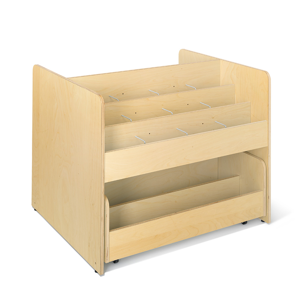 Populær, dobbeltsidet billedbogskrybbe i 3 etager med 2 flytbare rumdelere og udtræks-skuffer med 2 rum og hjul nederst på begge sider.