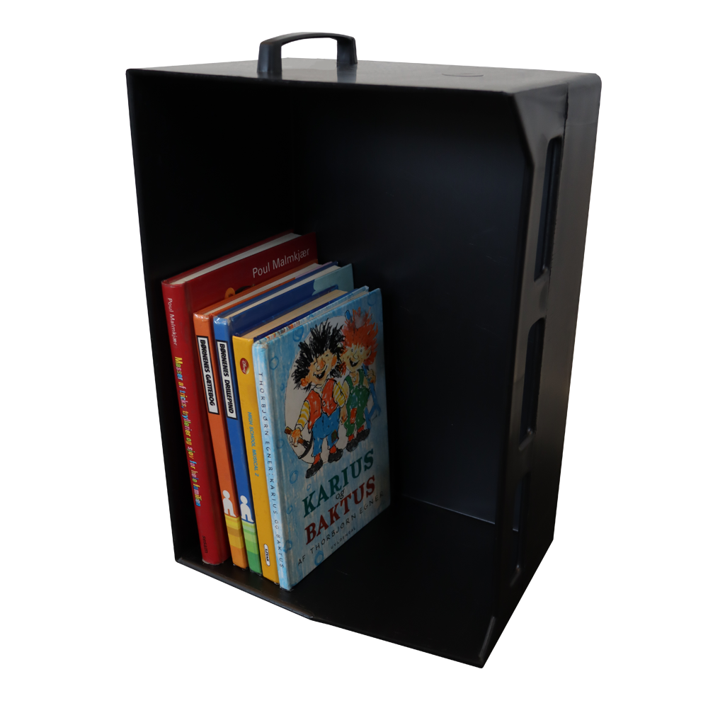 Solid bærekasse med håndtag til bøger og andre medier.