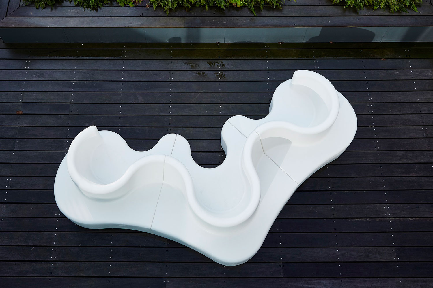 Cloverleaf er en modulær sofa til både inden- og udendørs brug. Ryglænet på hvert modul kan enten give privatliv eller åbne op for samtale.