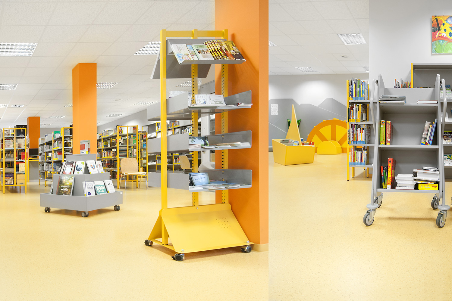 Ergonomisk, brugervenlig, enkeltsidet bogvogn med 4 hylder. Rigelig afstand mellem hylderne sikrer, at vognen også passer til bøger i større format.
