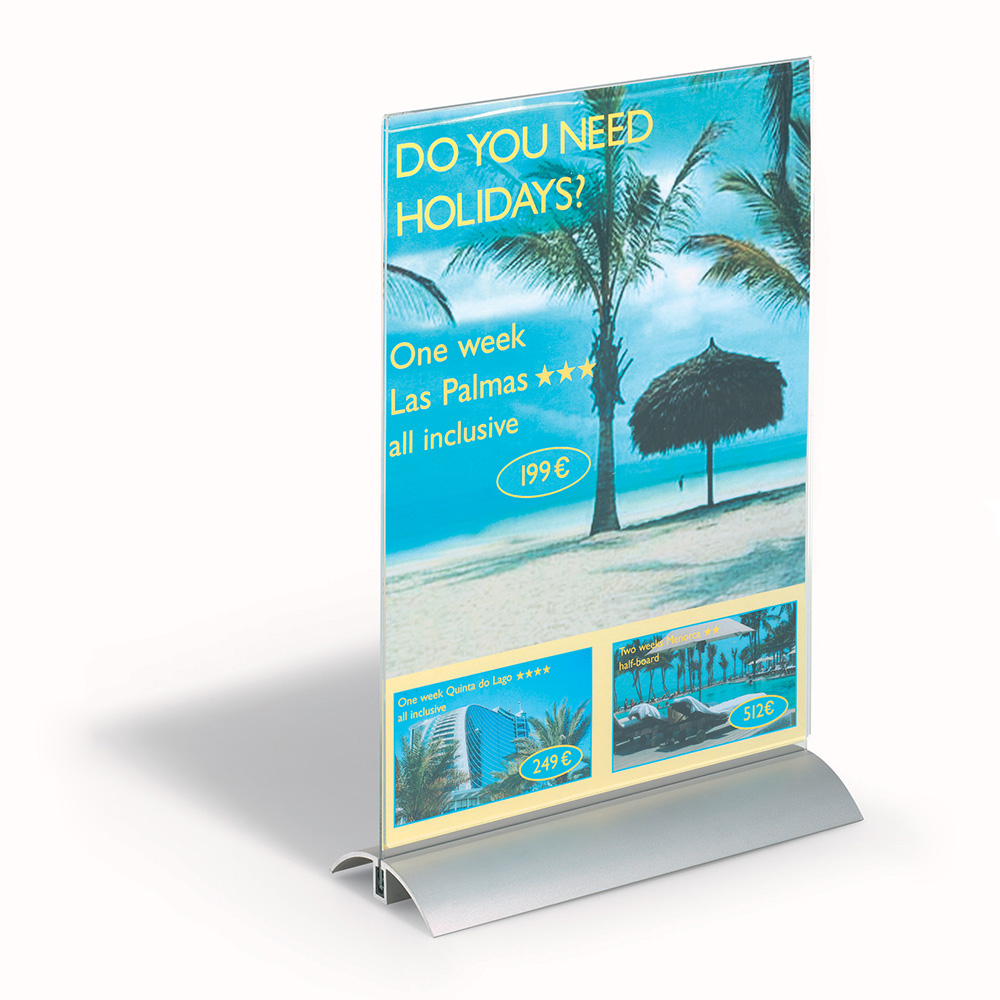 Eksklusiv dobbeltsidet skilteholder til bord, skranke, hylde, vinduer m.m.