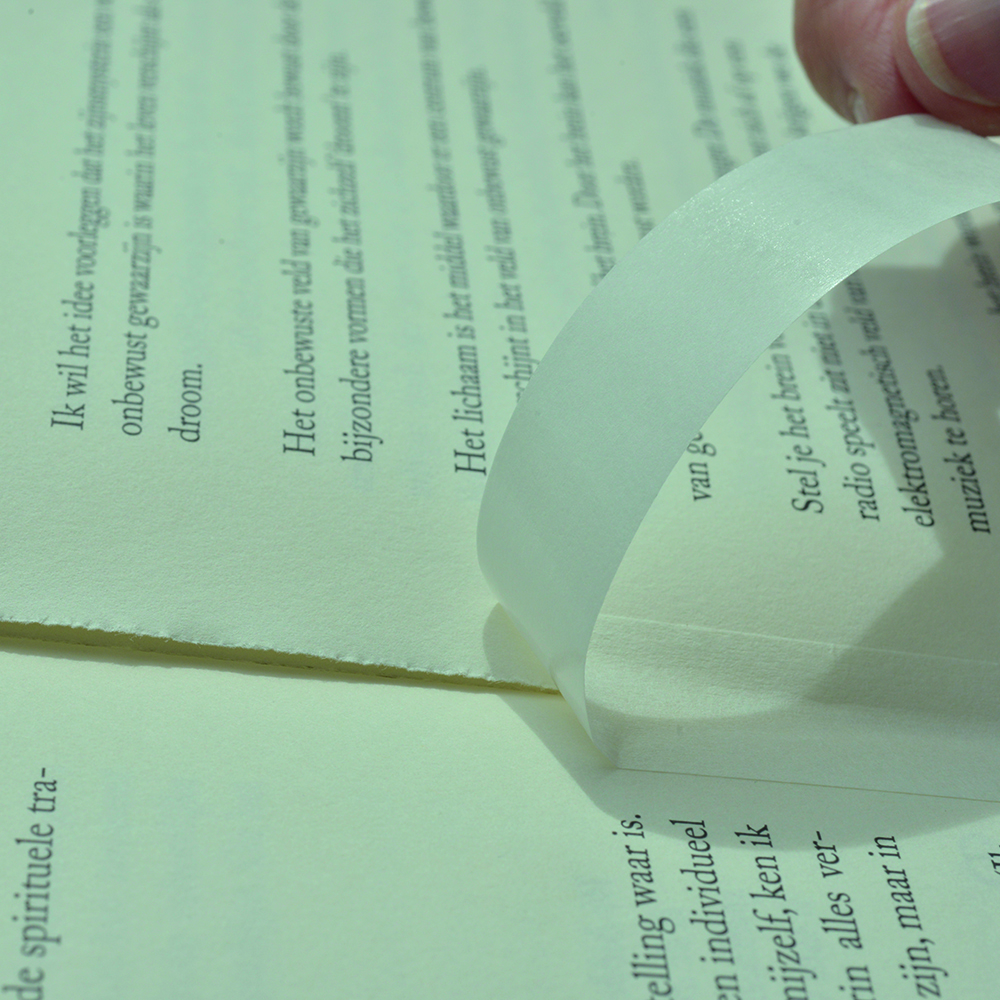 Ideel til at forstærke samlinger mellem bogomslag og bogsider. Høj hæfteevne og stor styrke; rives ikke let i stykker. Papiret er næsten usynligt og meget fleksibelt, perfekt til at lime i folder. God til fiksering af billeder, fotografier og grafik i passepartout eller bagstykke. Giver støvfri tætning af bagstykker.