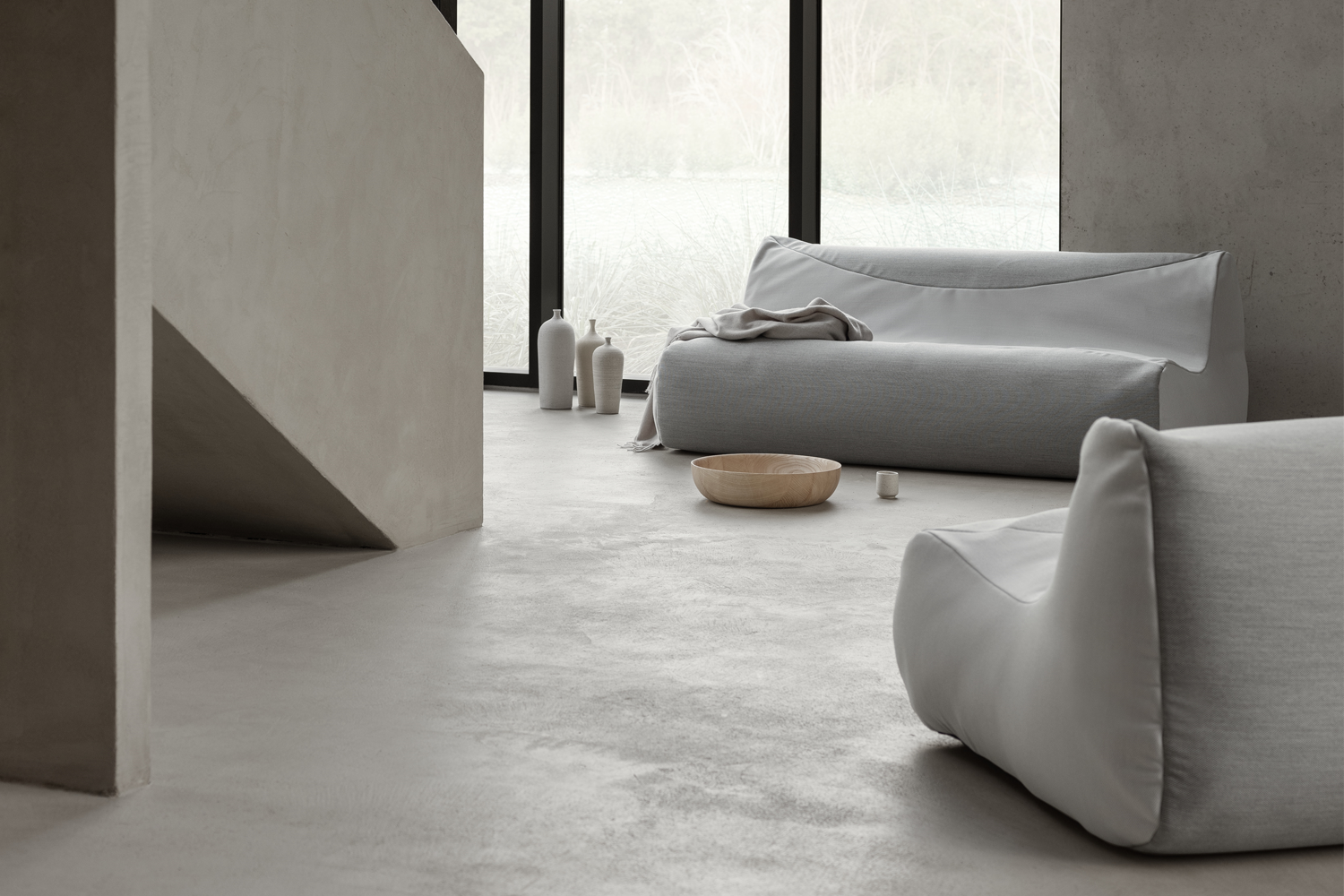 Fluid sofa og stol fra Softline har med inspiration i sækkestolen en behageligt form, som er yderst komfortabel at sidde i.