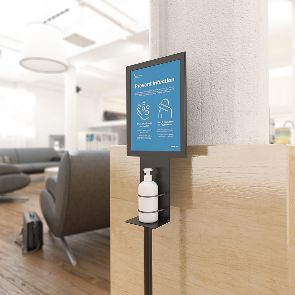 Stabil fritstående gulvstander til hånddesinfektion med A4 magnetramme til nem udskiftning af information.