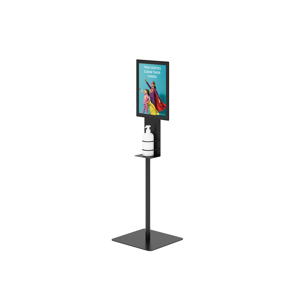 Stabil fritstående gulvstander til hånddesinfektion med A4 magnetramme til nem udskiftning af information.
