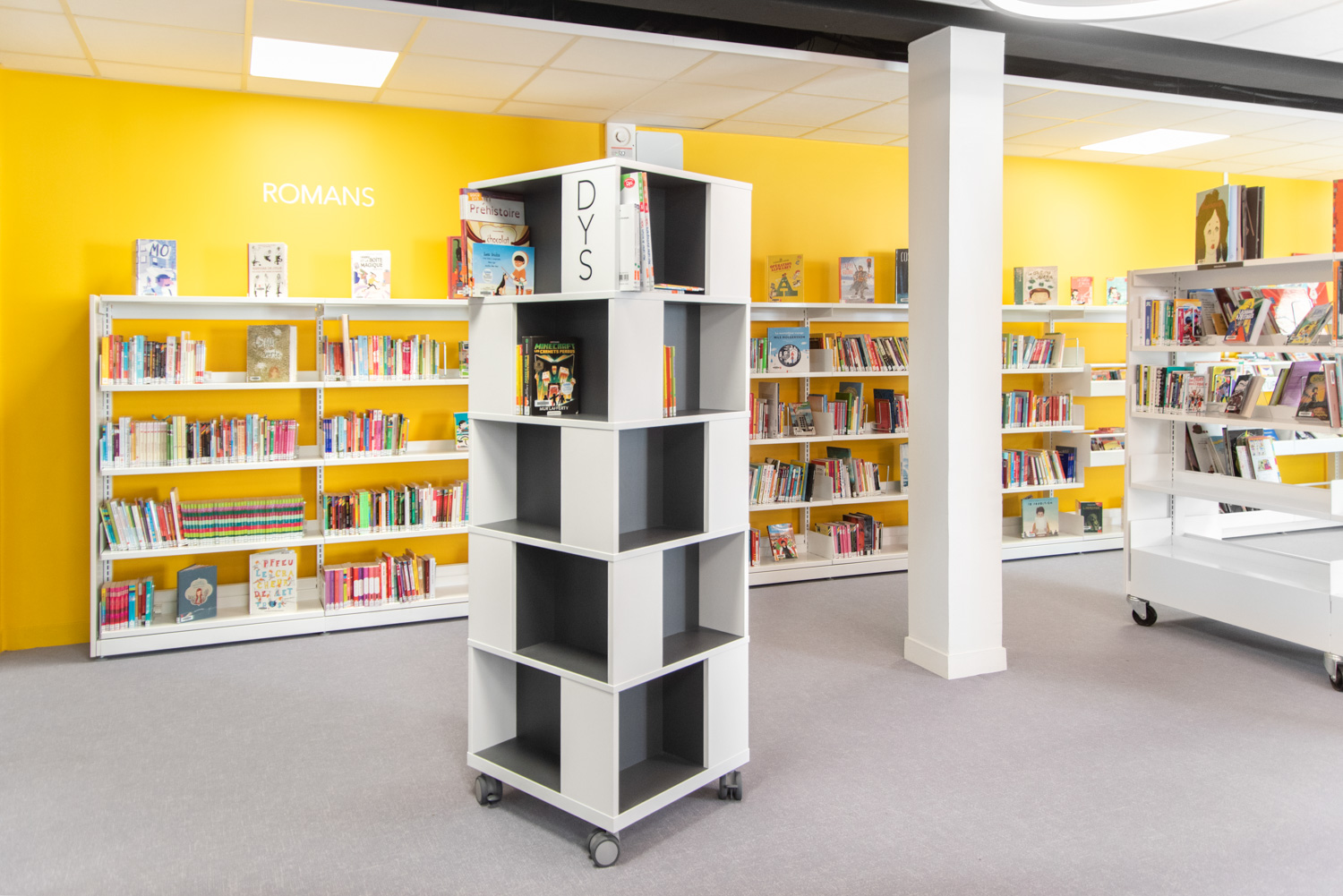 Fritstående, mobilt bogtårn. Stor kapacitet med 4 rum på hvert niveau.