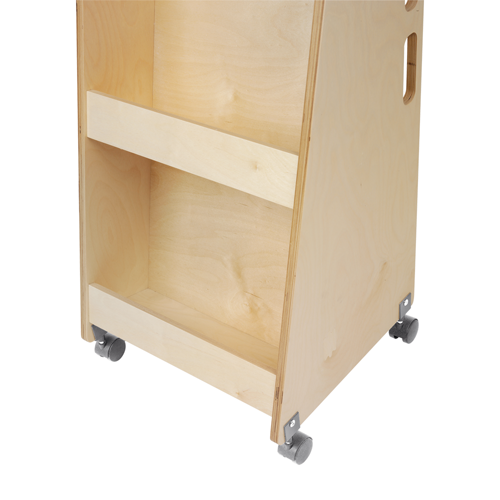 Flot bogvogn i birkefiner med 2 faste hylder med forkantliste til frontudstilling af f.eks. billedbøger.