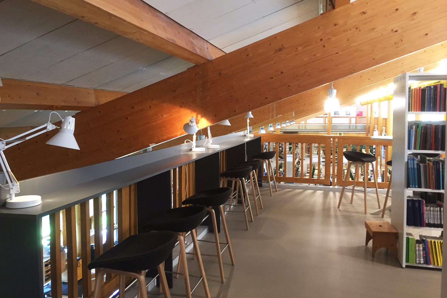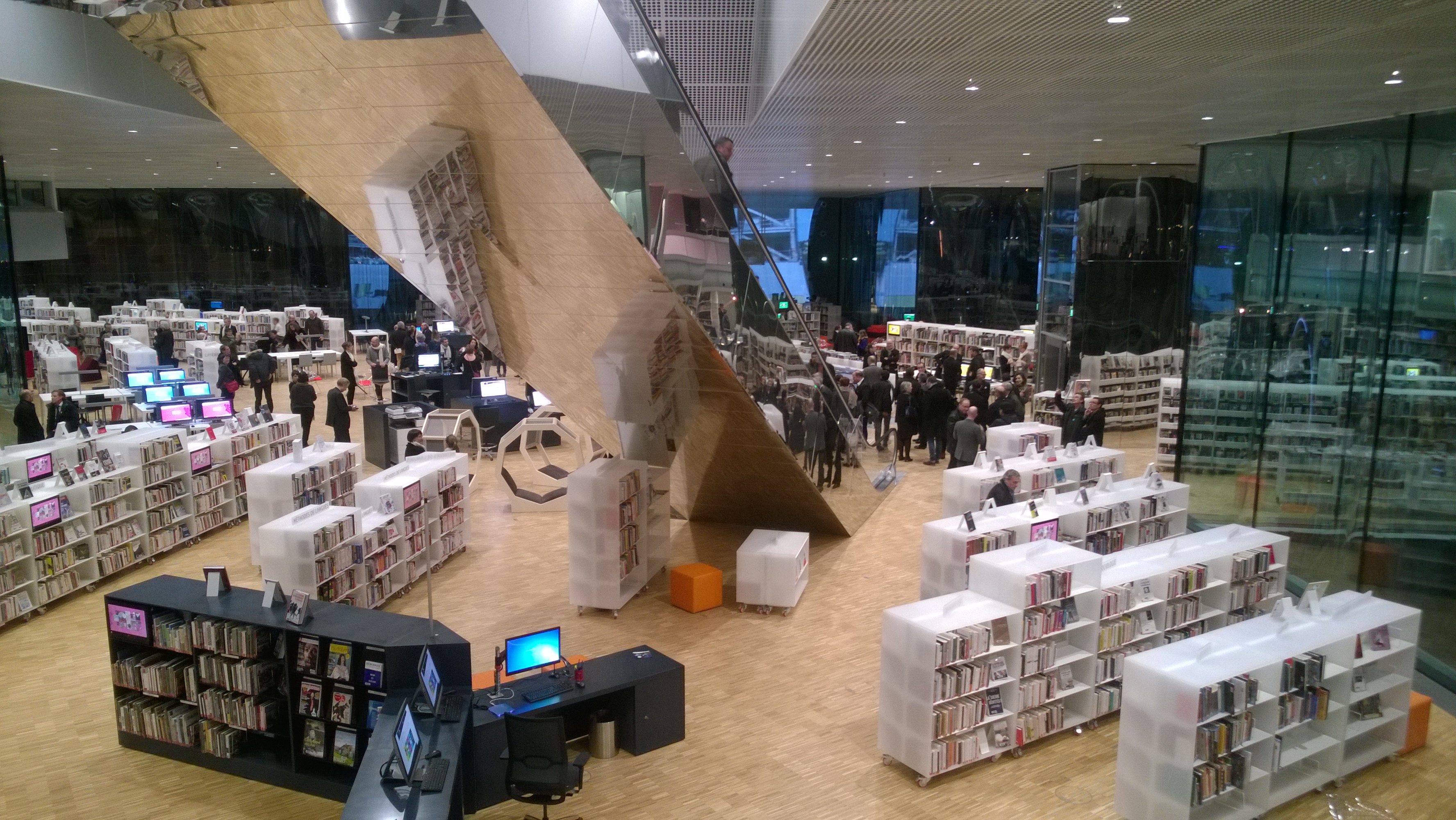 Med sine organiske former og bløde kurver viser dette bibliotek nytænkning. Det vises ikke kun i arkitekturen men også i reolsystemerne, der følger den organiske form. Der er masser af studieborde og