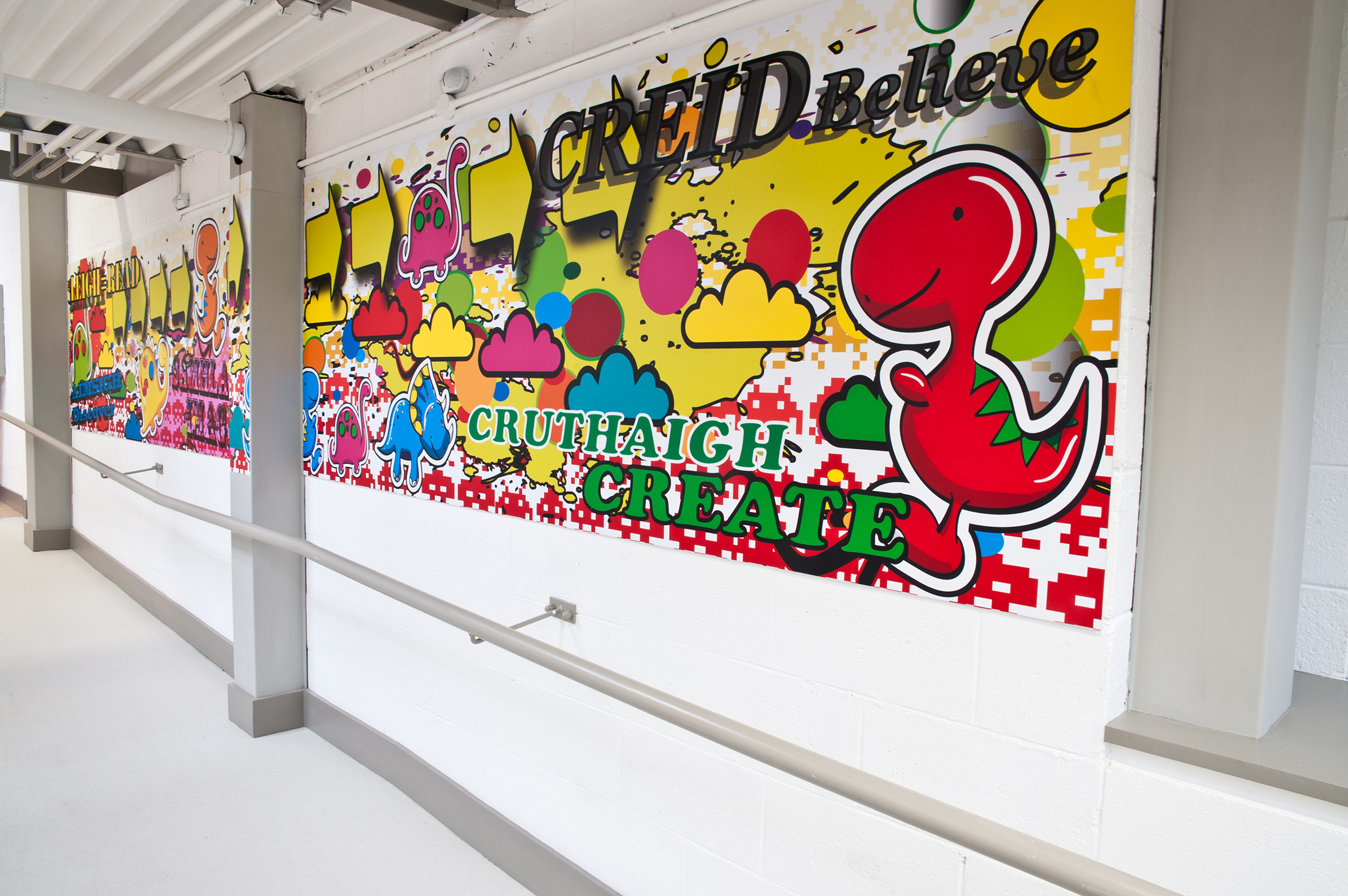Hovedtemaerne og zonerne i biblioteket er styrket ved brug af grafik og skiltning, og med tilladelse af børneprismodtager Julia Donaldson brugte vi hendes populære Gruffalo billeder som væggrafik i bø
