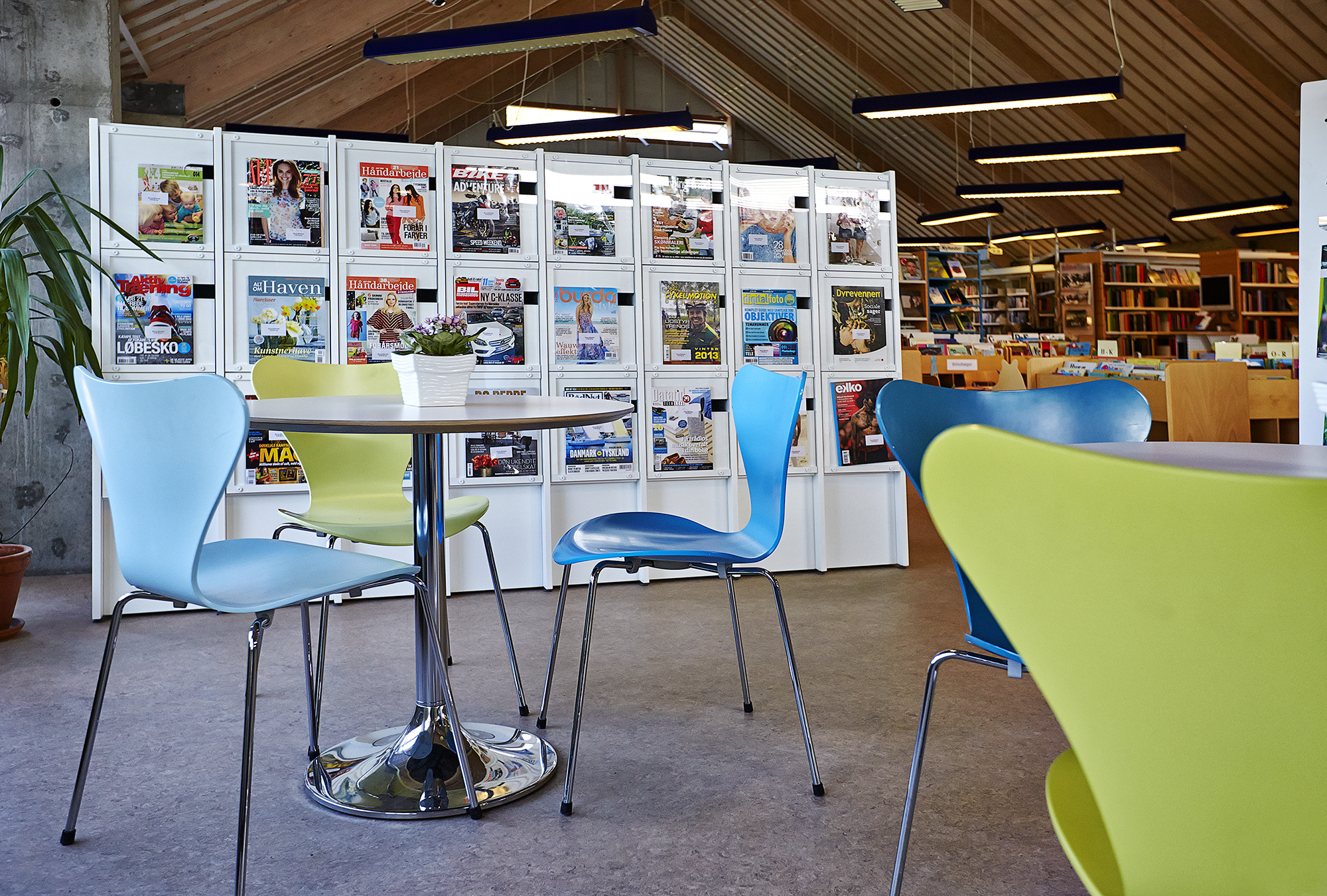 Vores indretningsarkitekt Lykke Jørgin overtog et idéoplæg udarbejdet af Signal Arkitekter. De fleste reoler er genbrug, og som en del af den nye indretning har Lykke tegnet specialmøbler, som deler rummet op samt understreger og adskiller de forskellige materialegrupper.