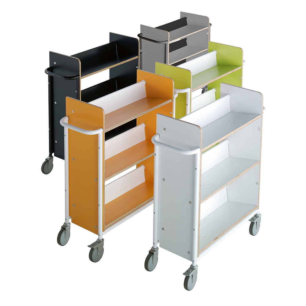 Funktionel, enkeltsidet vogn med 3 faste bagudvippede hylder, som sikrer stabil opbevaring. Vognen er rummelig, både hvad angår dybden og afstanden mellem hylderne og kan bruges både til alle størrelser bøger og ringbind.