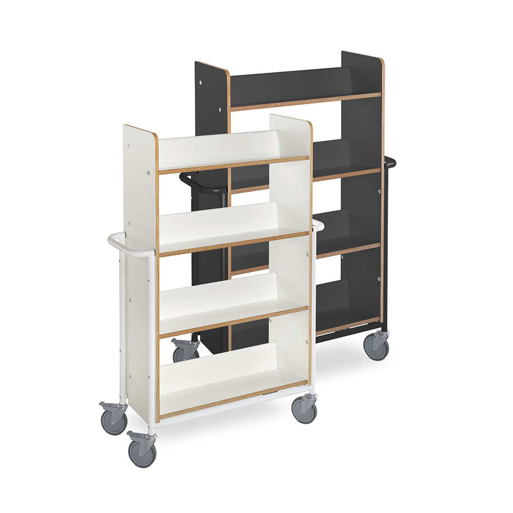 Funktionel, enkeltsidet vogn med 4 faste bagudvippede hylder, som sikrer stabil opbevaring. Vognen er rummelig, både hvad angår dybden og afstanden mellem hylderne og kan bruges både til alle størrelser bøger og ringbind.
