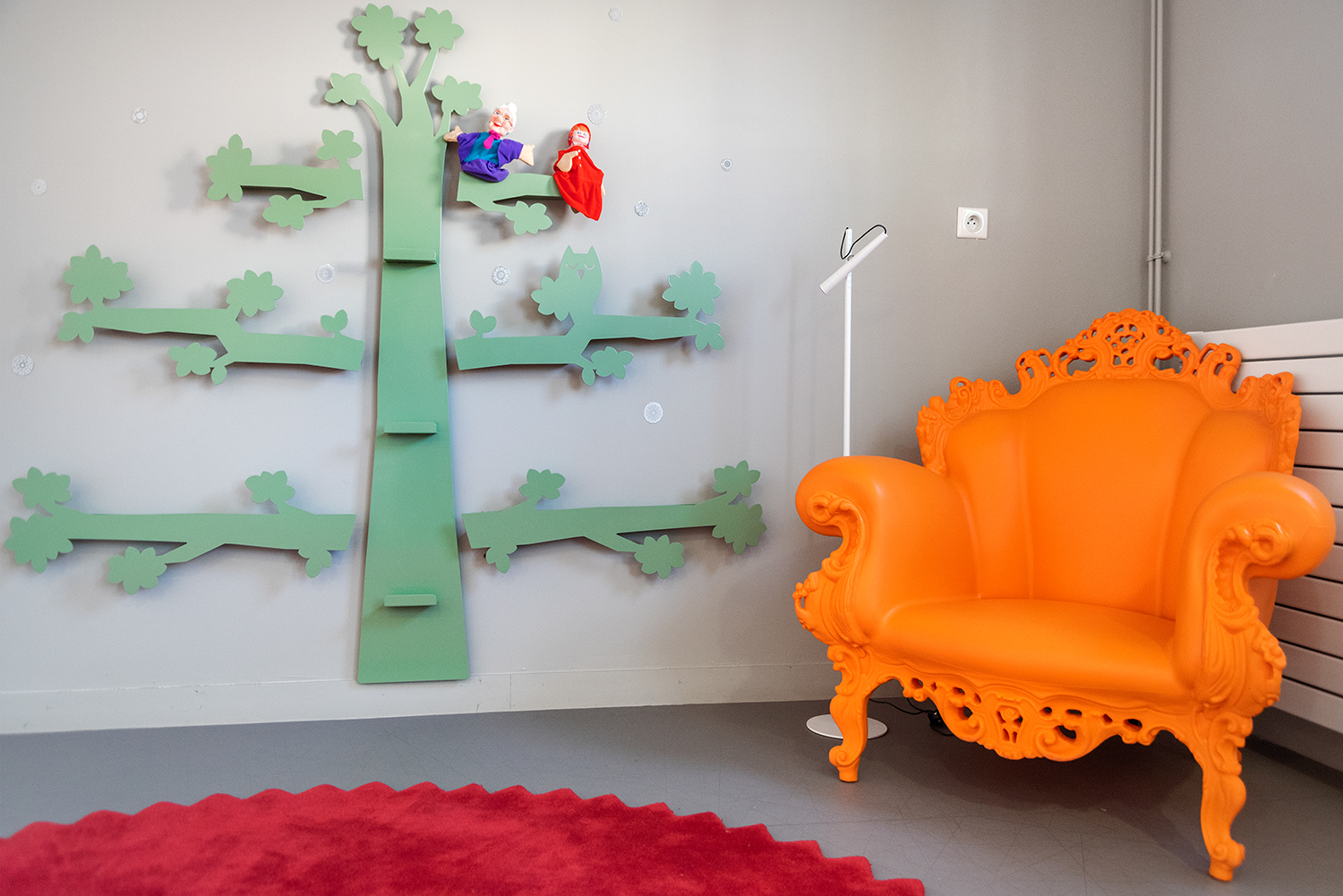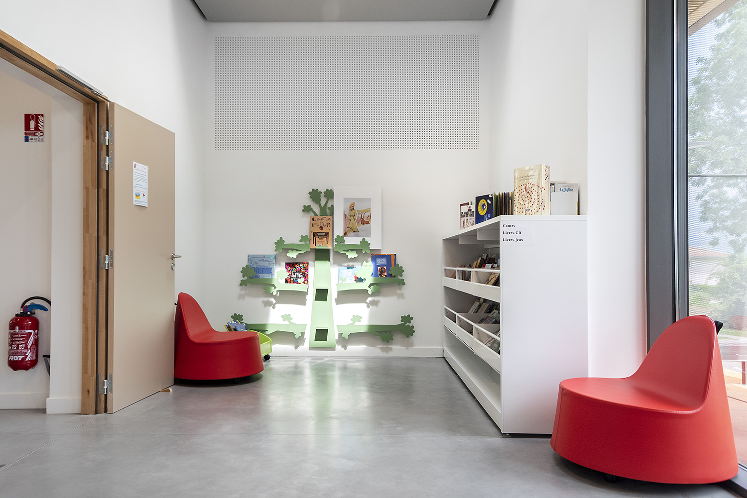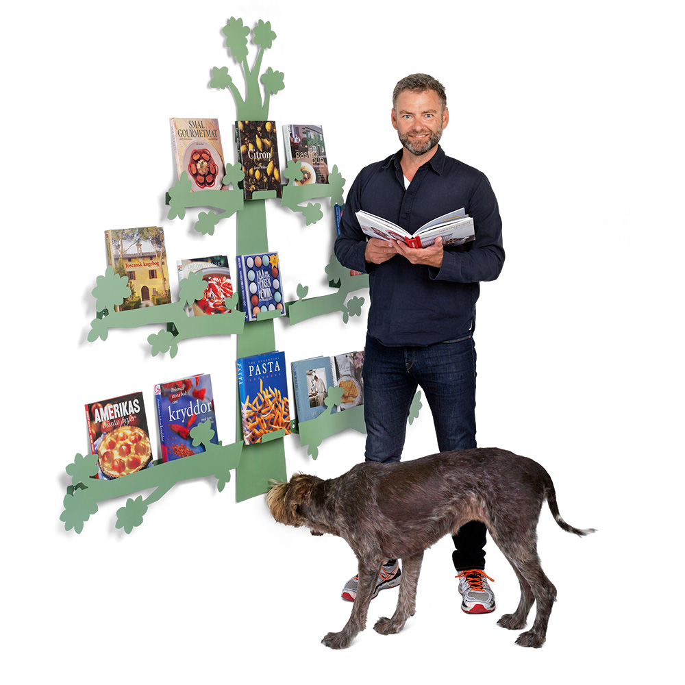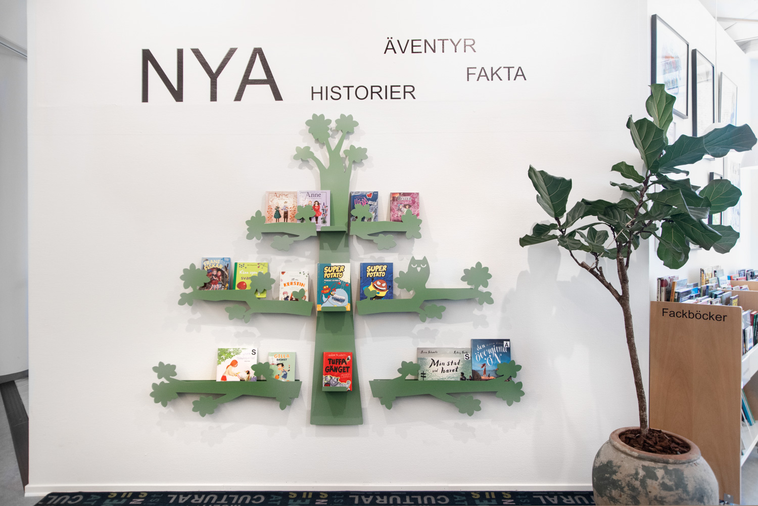 Fleksible og iøjnefaldende udstillingshylder til bøger og andre medier formet som et dekorativt træ.