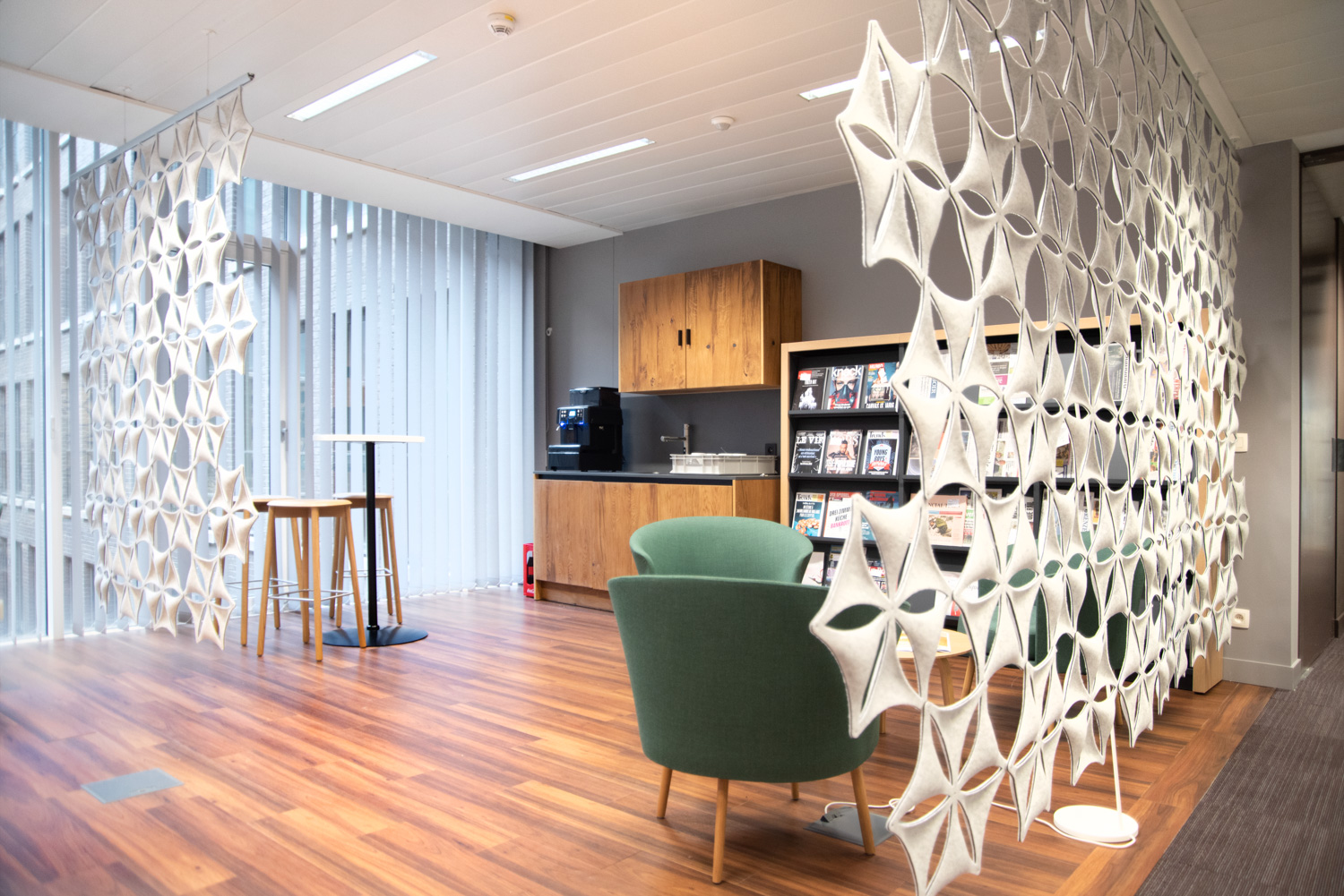 De runde reoler medvirker til, at indretningen føles behagelig og afslappende. De besøgende kan slå sig ned i en af de mange forskellige slags stole og lænestole. Farverne i biblioteket er varme og behagelige. Kombinationen mellem de udvalgte møbler og farver gør rummet til et behageligt hvileområde, hvor der kan tages en pause fra en travl hverdag.
