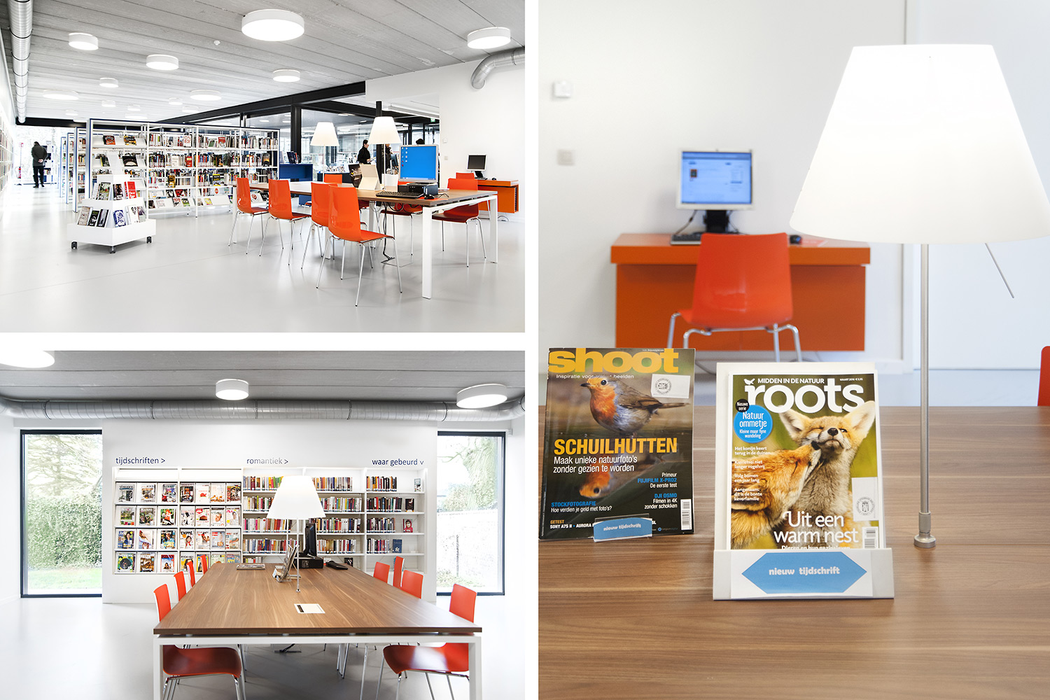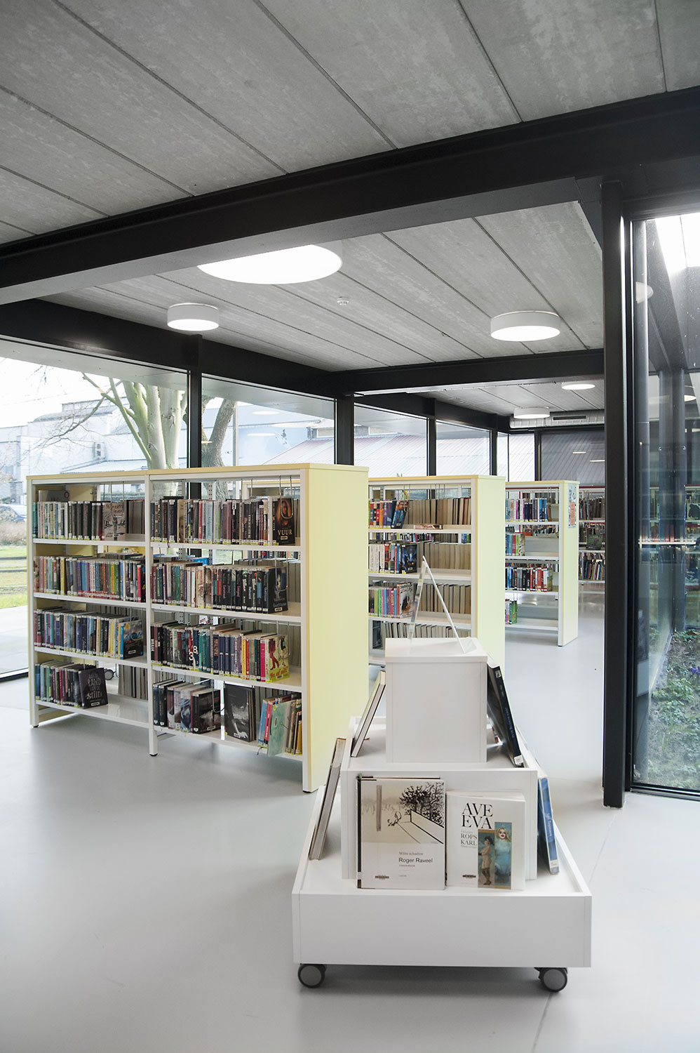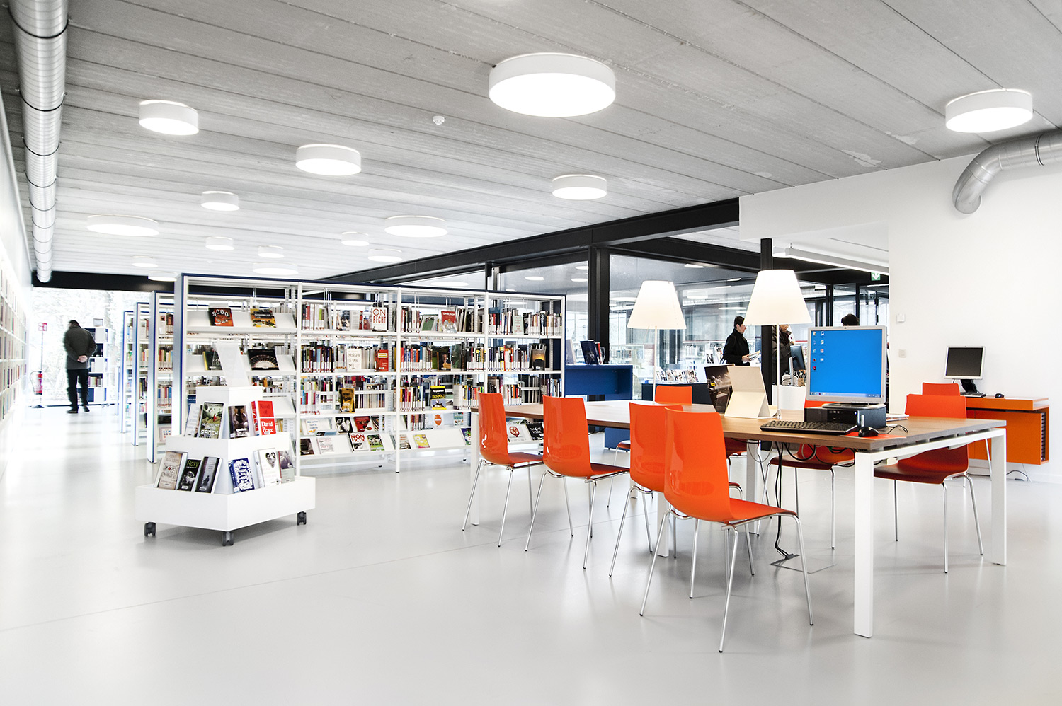 Rigeligt med naturligt lys og udsigt til parken danner grundlaget for et behageligt bibliotek i et moderne, tidløst design. Farvedetaljer linker til de forskellige målgrupper. Hylder er indkapslet for at bevare det stramme design.