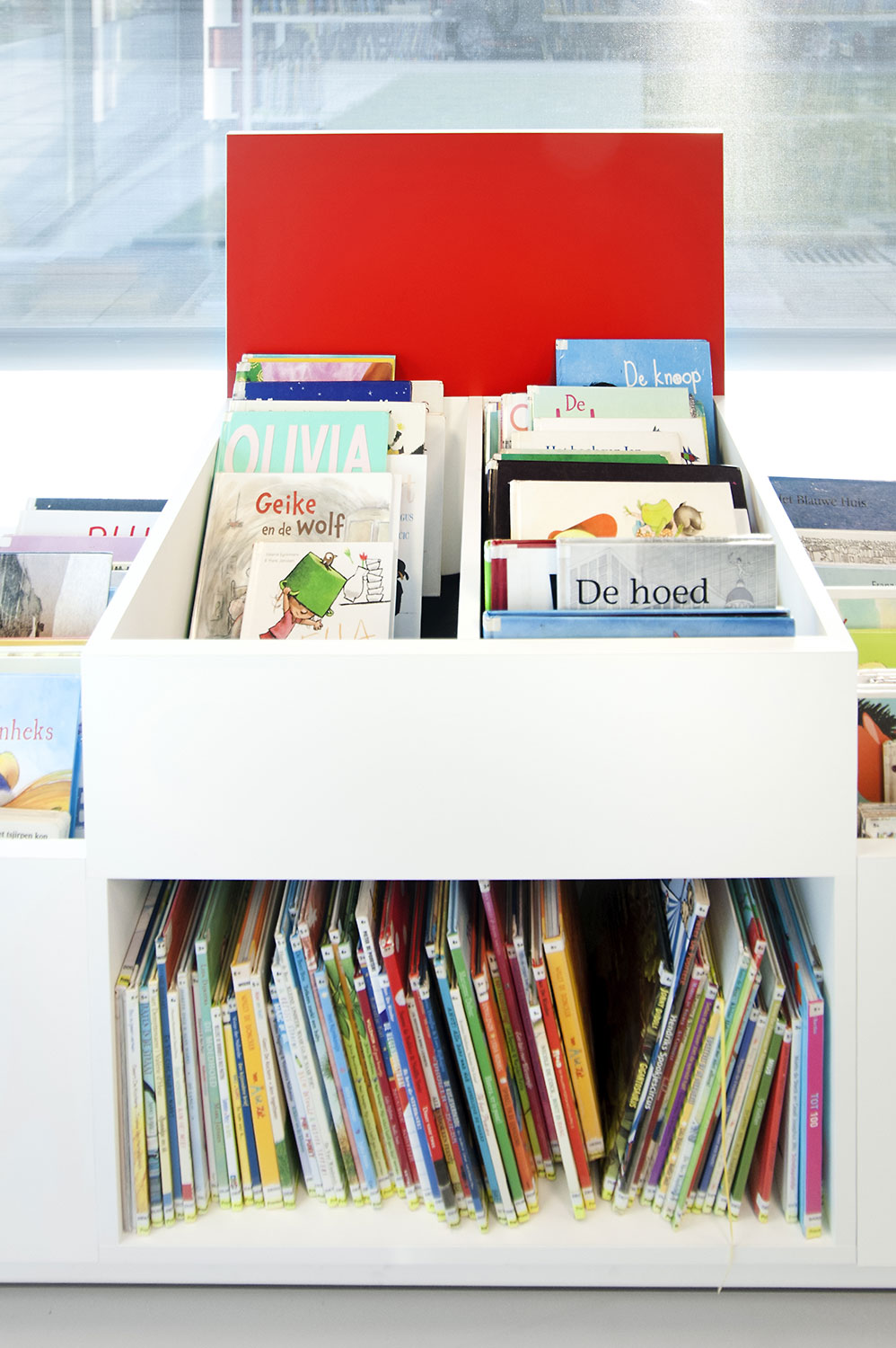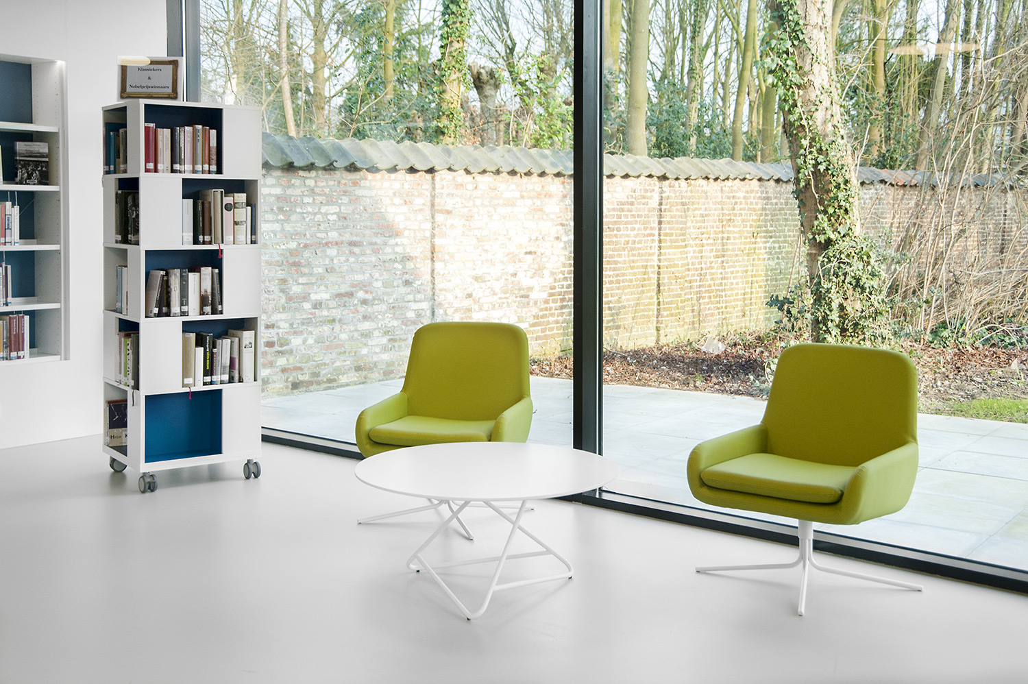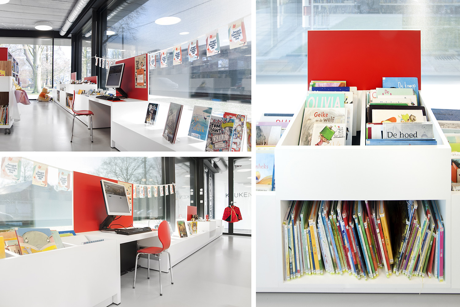 Rigeligt med naturligt lys og udsigt til parken danner grundlaget for et behageligt bibliotek i et moderne, tidløst design. Farvedetaljer linker til de forskellige målgrupper. Hylder er indkapslet for at bevare det stramme design.