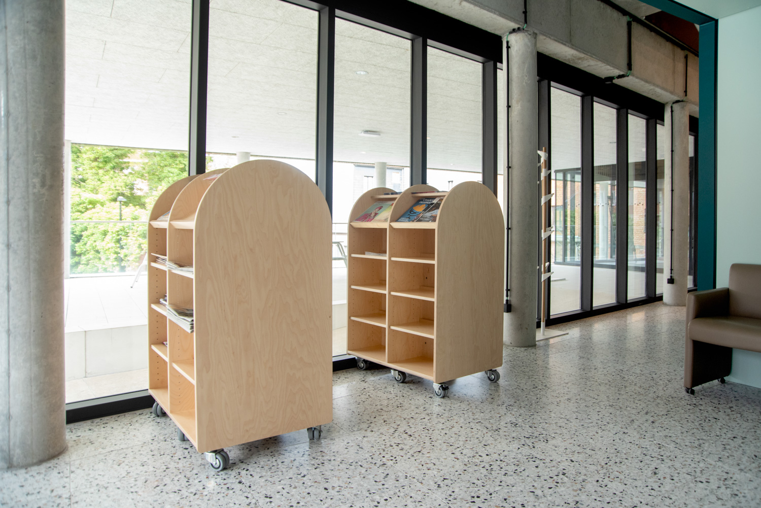 I hele biblioteket er reolerne hvide for at trække opmærksomheden mod indholdet – nemlig bøgerne. Bygningens moderne farvepalette bliver afspejlet i biblioteksmøblerne.