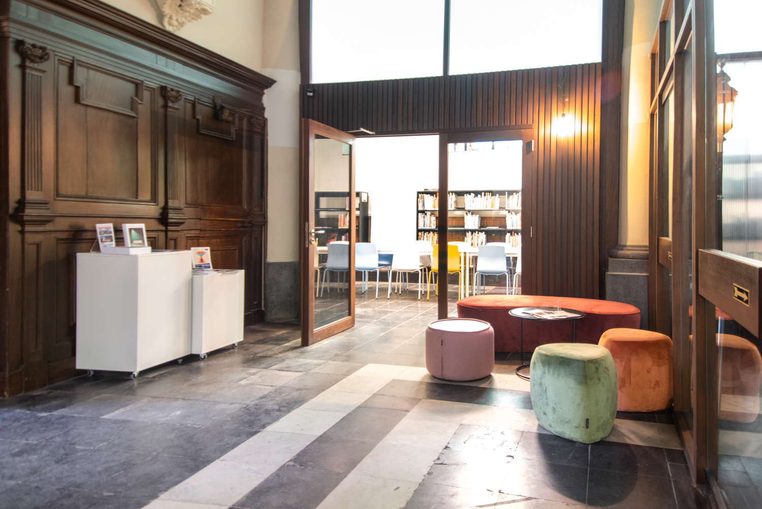 Omend designet er tilpasset den oprindelige arkitektur med hensyn til farver og materialer, danner indretningen ramme om et moderne bibliotek med en nutidig indretningsstil.