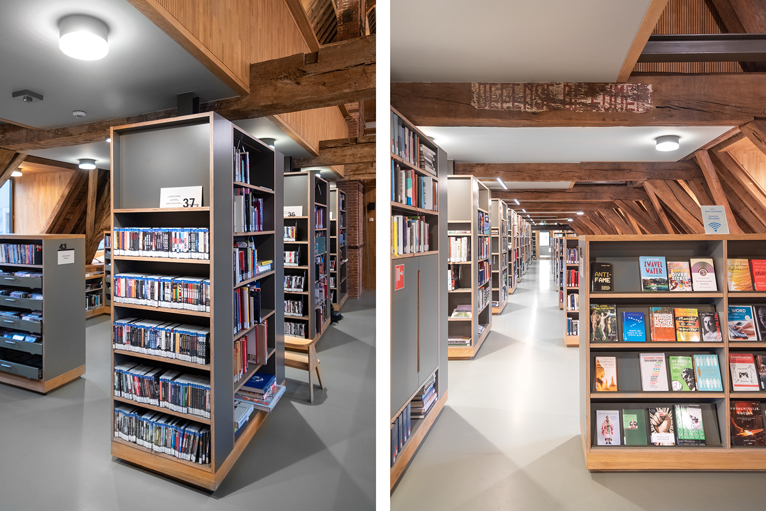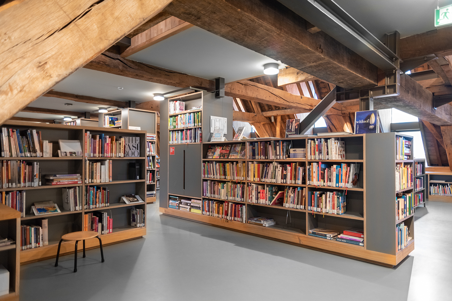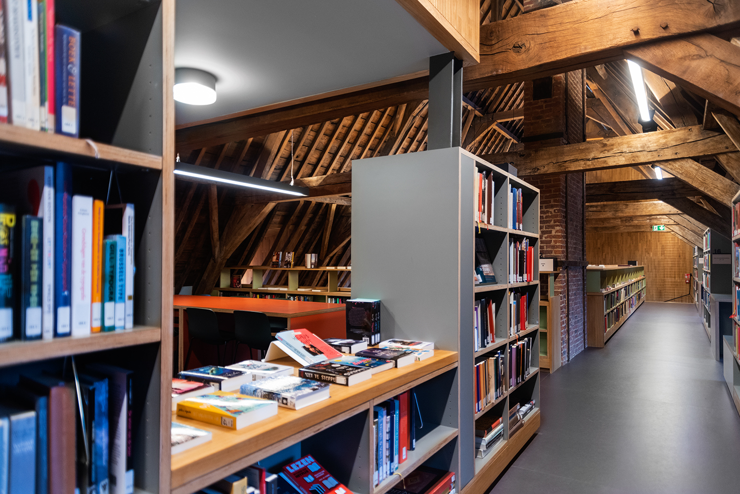 Bøgerne er arrangeret frontalt i lave bogkrybber, og samlingen følger bygningens konturer. Indretningen af biblioteket er en kombination af specialløsninger og standardmøbler, der er valgt med en bæredygtig finish. Således er Het Predikheren klar til et nyt kapitel i sin historie.
