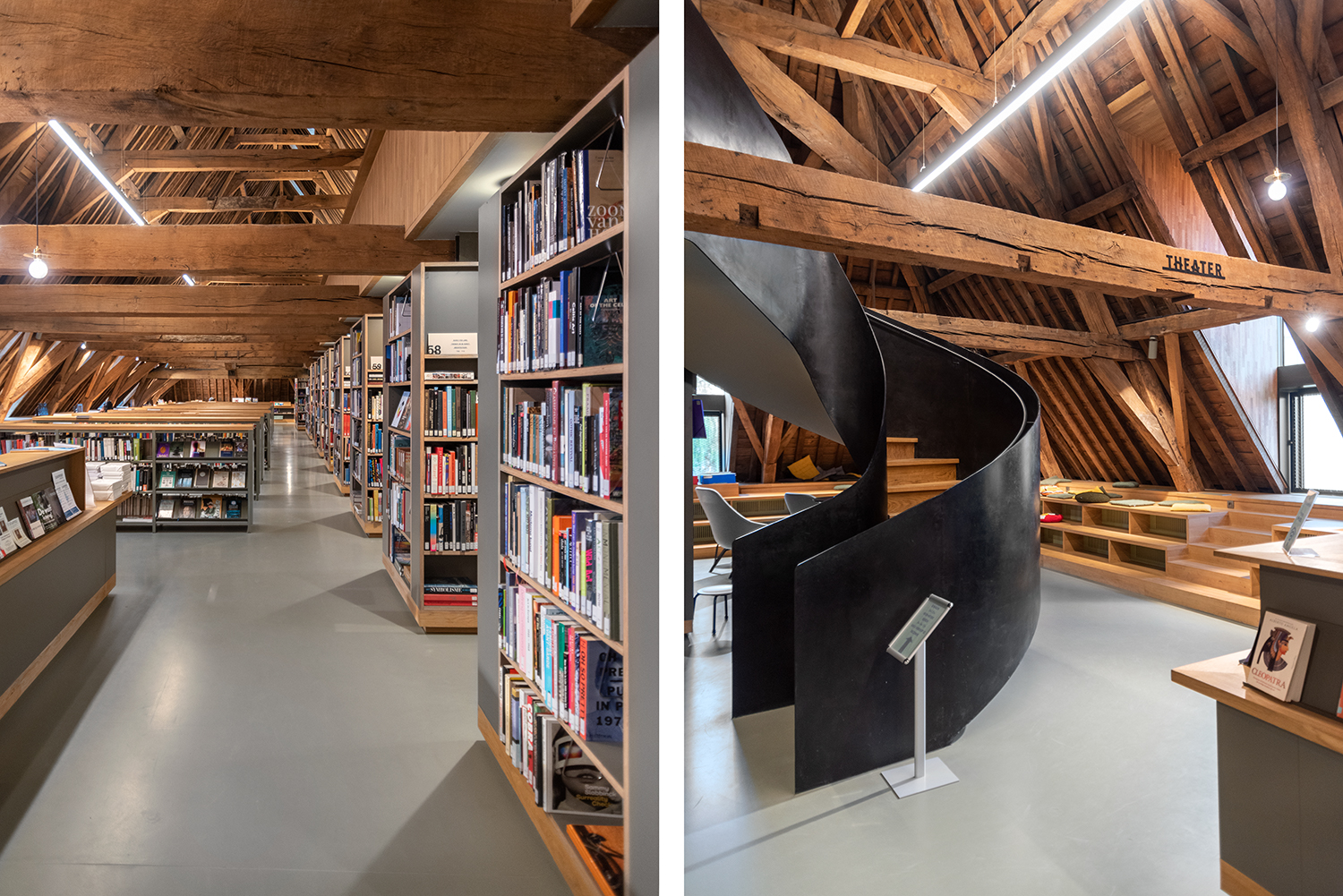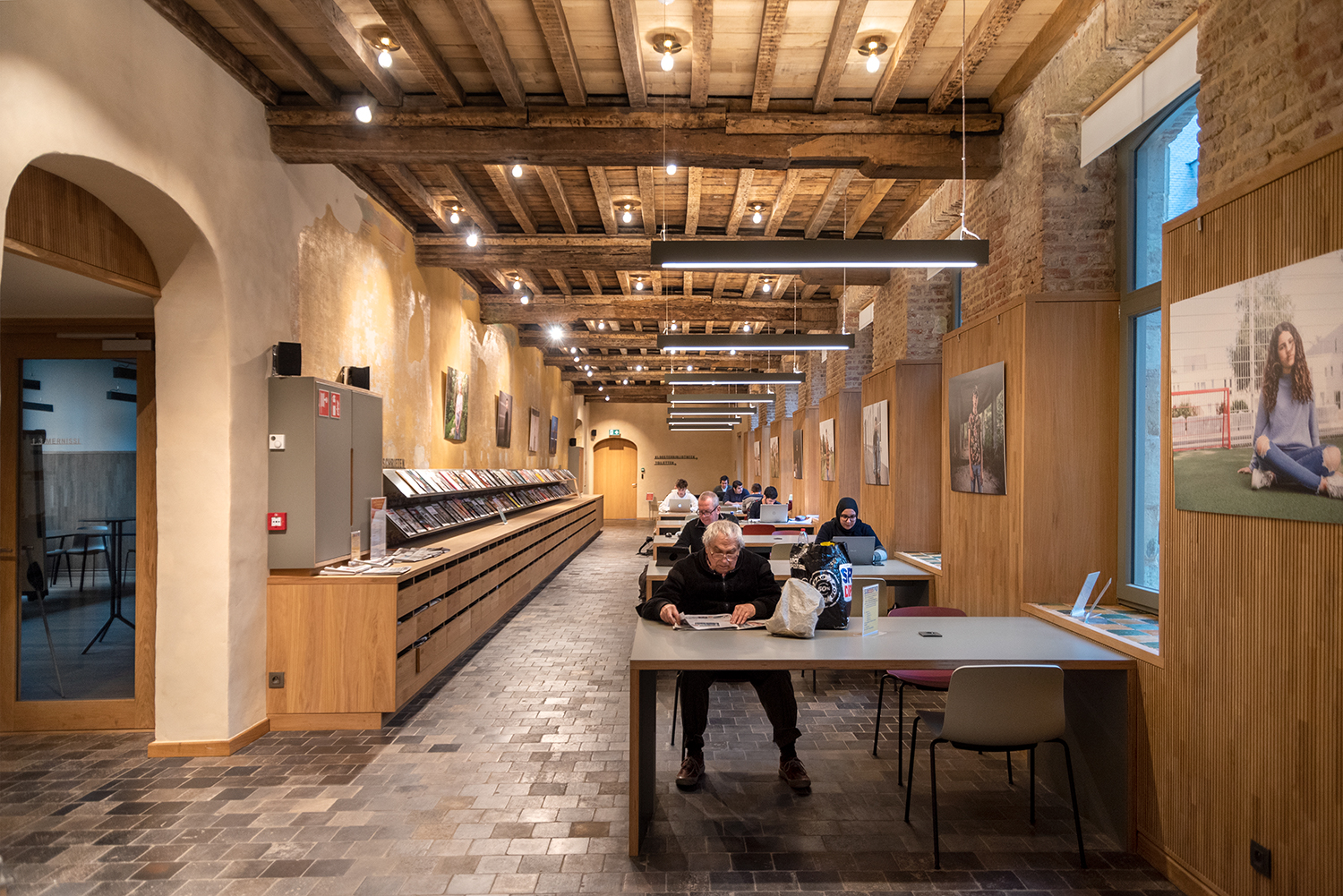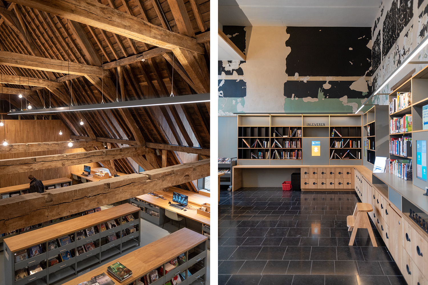 Bøgerne er arrangeret frontalt i lave bogkrybber, og samlingen følger bygningens konturer. Indretningen af biblioteket er en kombination af specialløsninger og standardmøbler, der er valgt med en bæredygtig finish. Således er Het Predikheren klar til et nyt kapitel i sin historie.