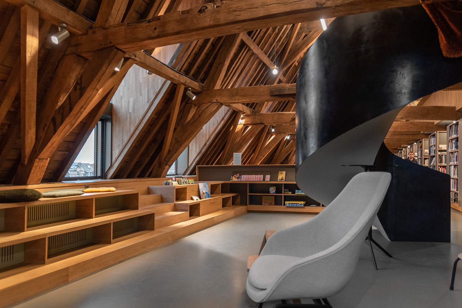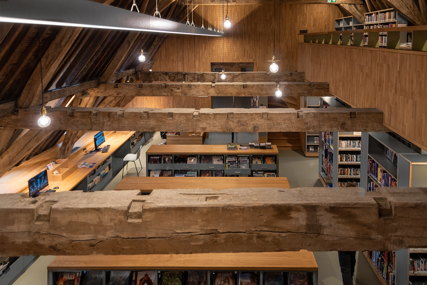 Børne- og ungdomsafdelingen er placeret på loftet. Et unikt rum, hvor de originale egetræsbjælker stadig er en del af tagkonstruktionen. Varmen fra træet omfavner dig og fortsætter i møblerne. Et ideelt sted for unge mennesker til at bladre igennem bøgerne.