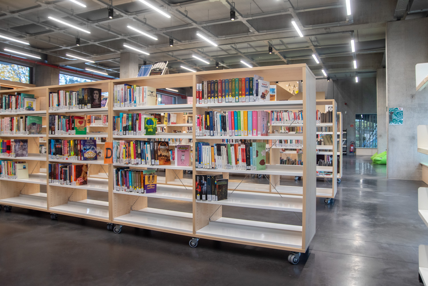 Det varme træ på reolerne giver en dejlig balance og står godt i kontrast til det mere kølige og industrielle look i resten af biblioteksindretningen.