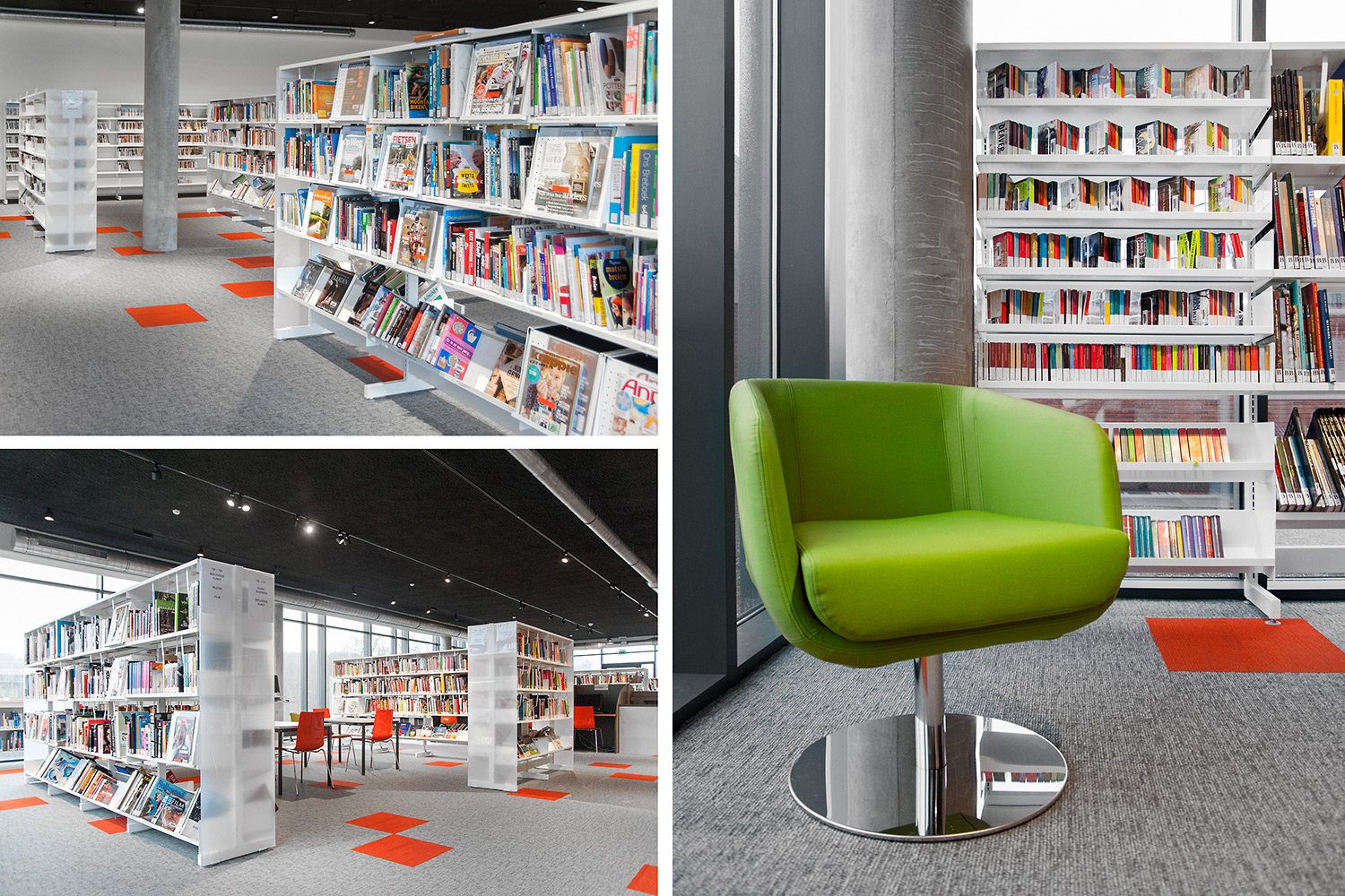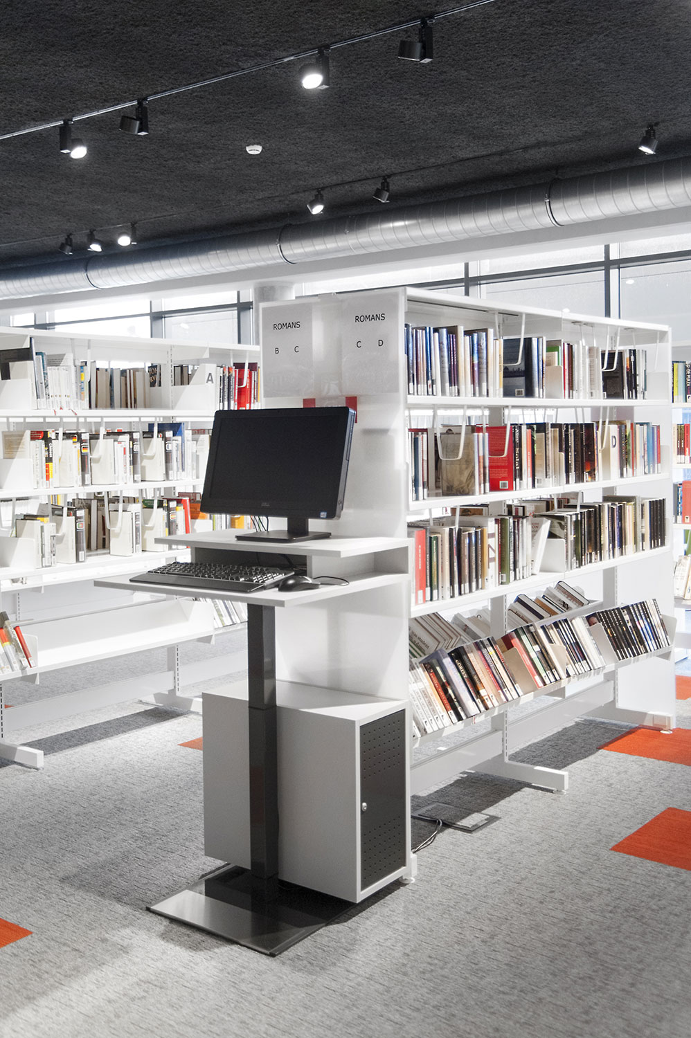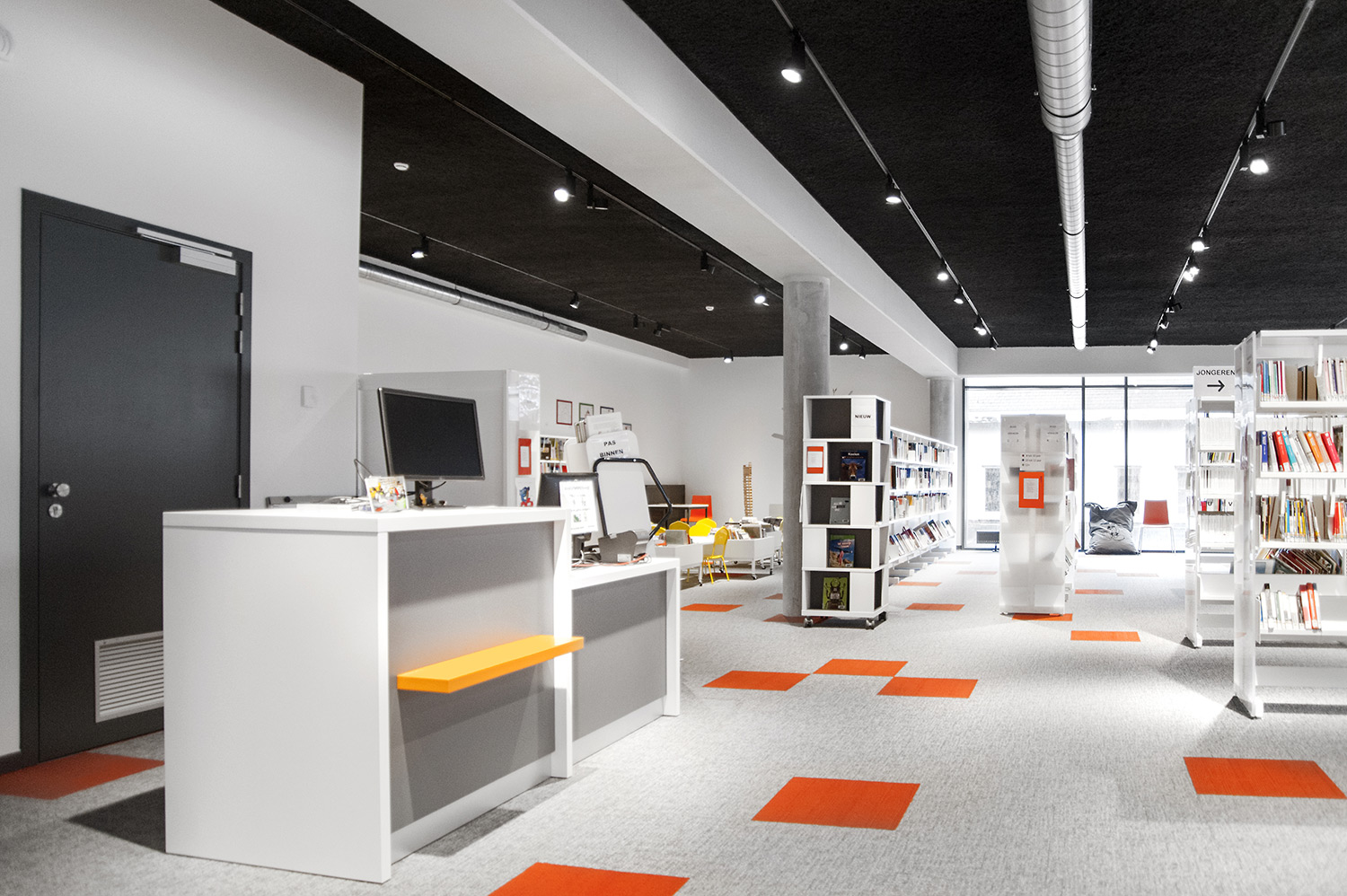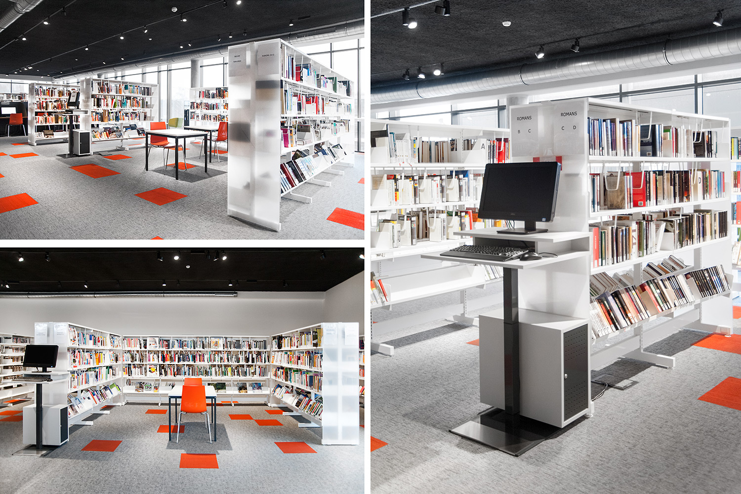I indretningen er der især fokus på det ergonomiske reolsystem, børneområdet, siddemøbler, læseområder og arbejdsstationer. Det sorte loft danner en kontrast til de hvide møbler, som skaber et behageligt miljø takket være dets begrænsede højde og enkle design.