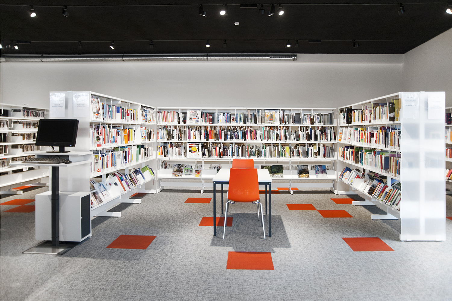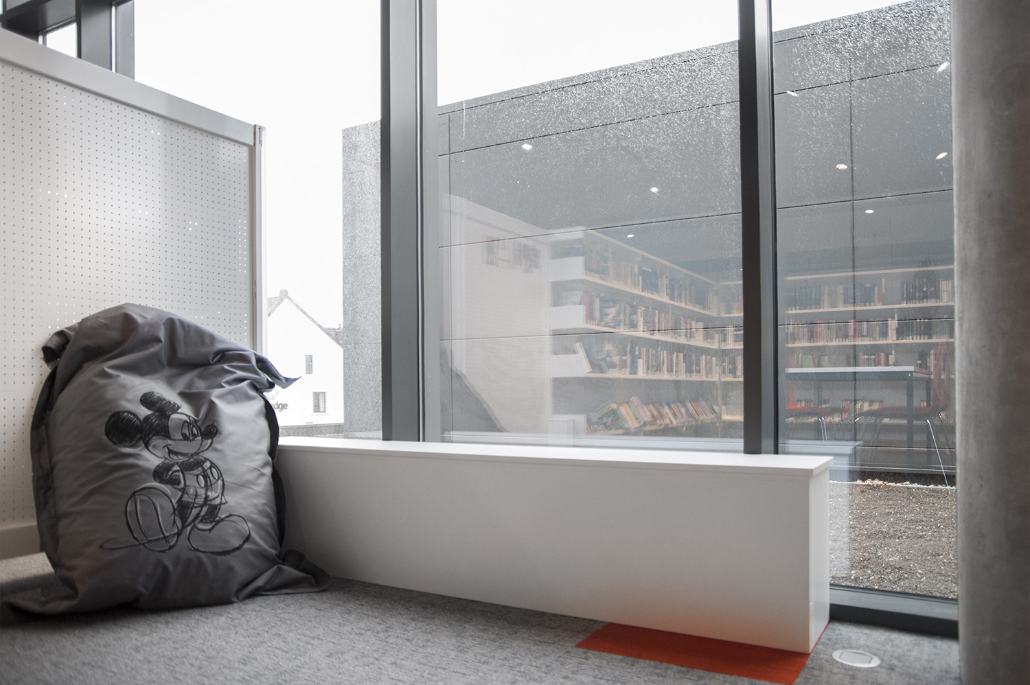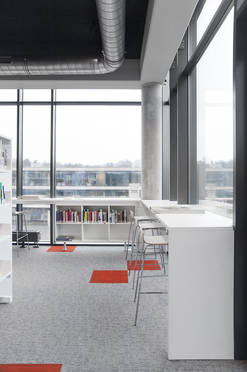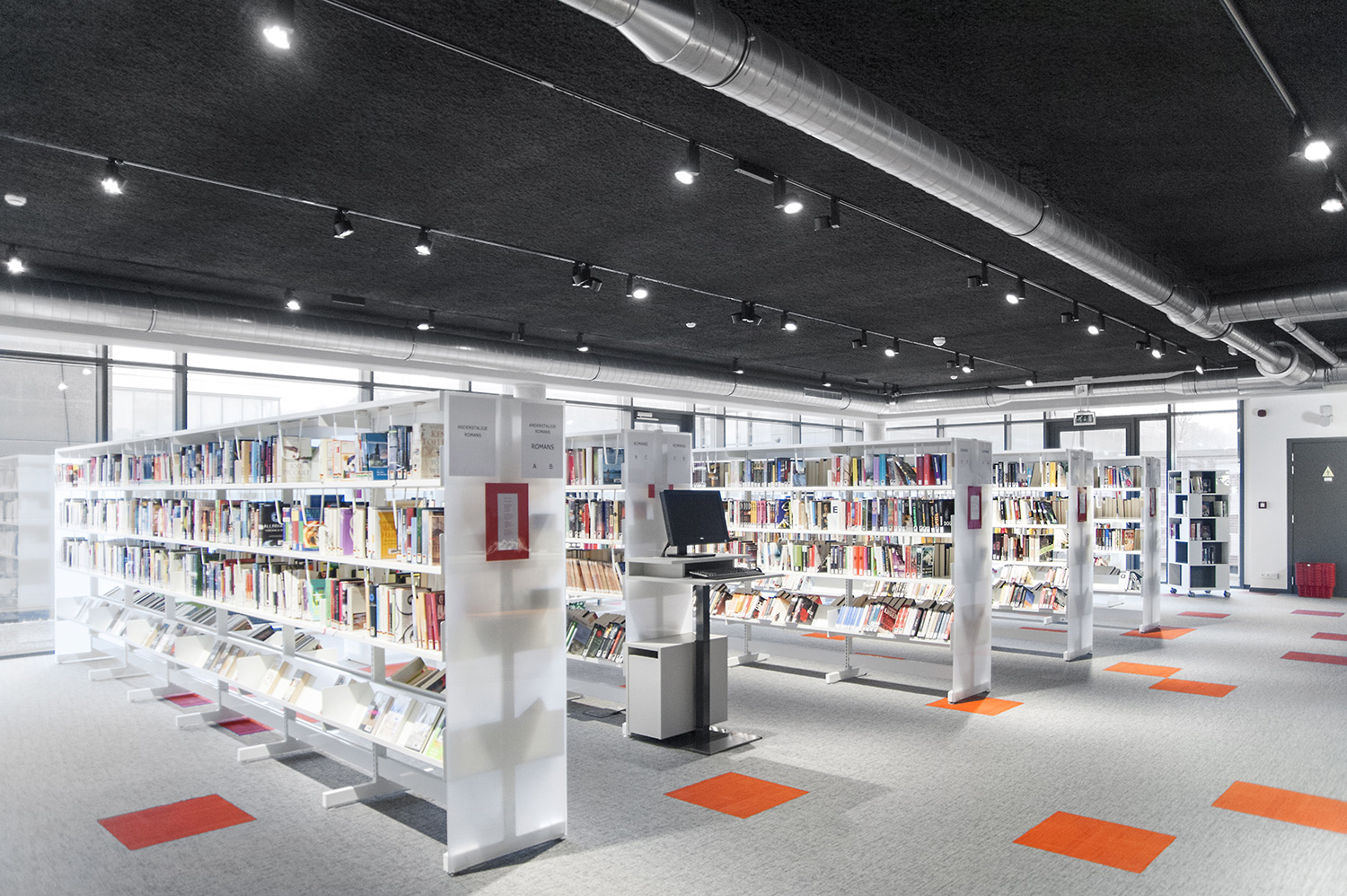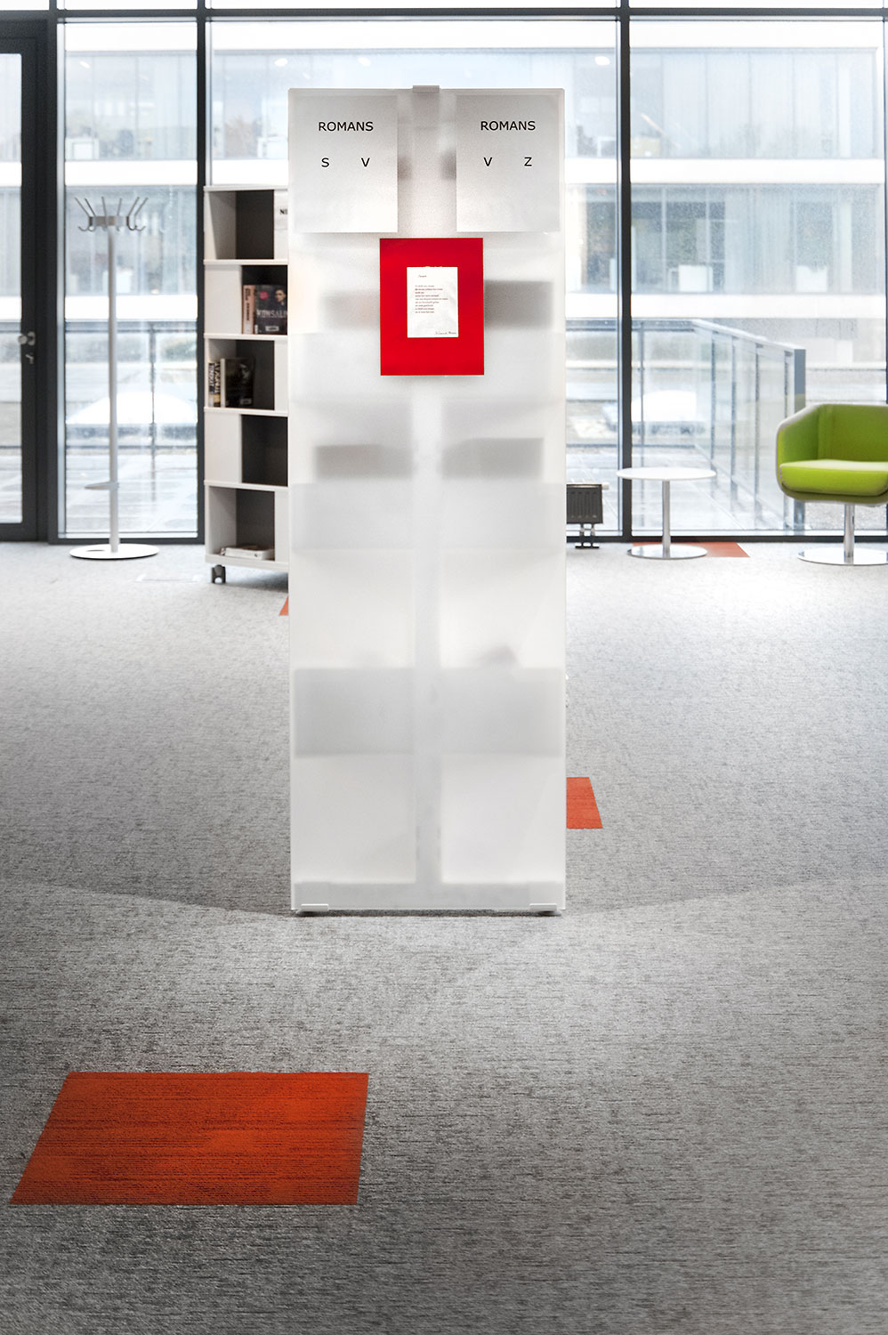 I indretningen er der især fokus på det ergonomiske reolsystem, børneområdet, siddemøbler, læseområder og arbejdsstationer. Det sorte loft danner en kontrast til de hvide møbler, som skaber et behageligt miljø takket være dets begrænsede højde og enkle design.