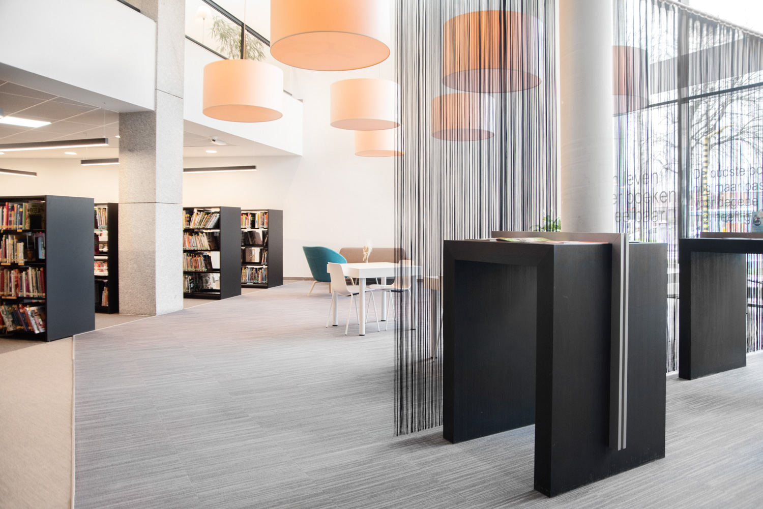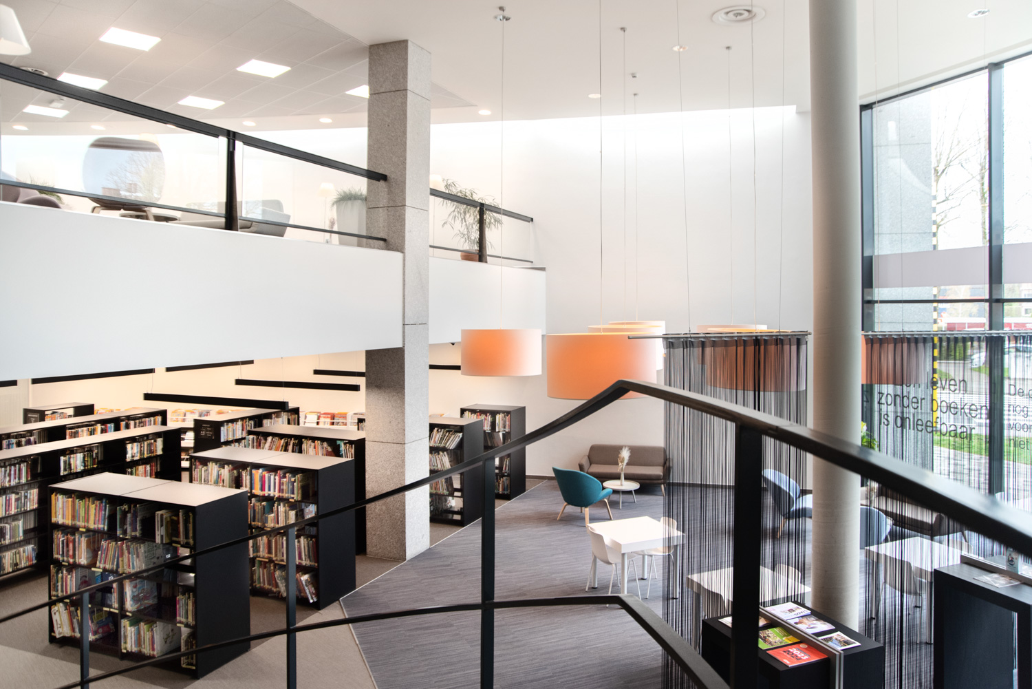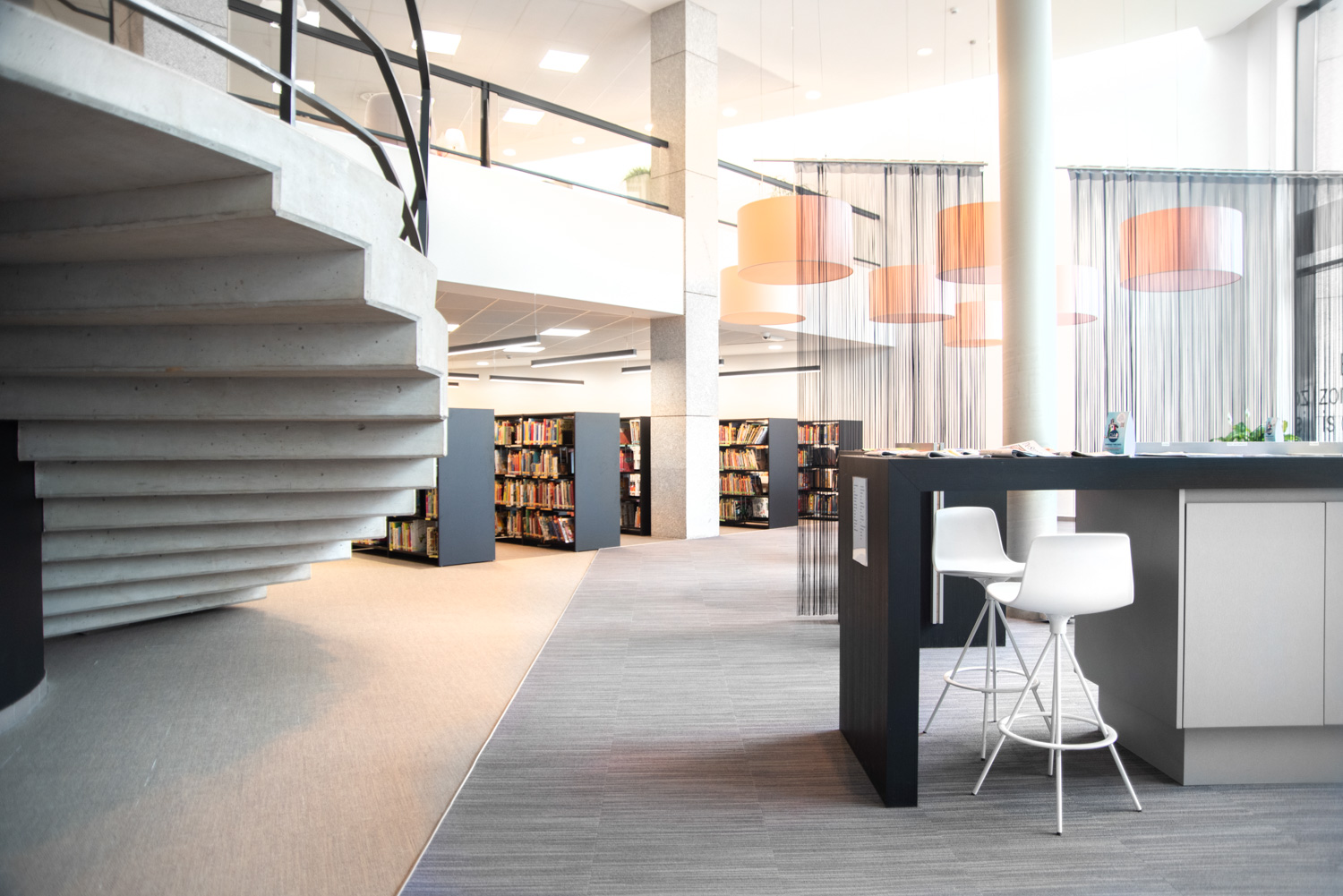 Besøgende kommer ikke kun til biblioteket for at låne bøger; de bruger også biblioteket til at studere i rolige omgivelser, læse avisen eller mødes over en snak. Derfor er der blevet installeret komfortable loungeområder. Nye materialer præsenteres ved indgangen samt på reolernes endegavle.