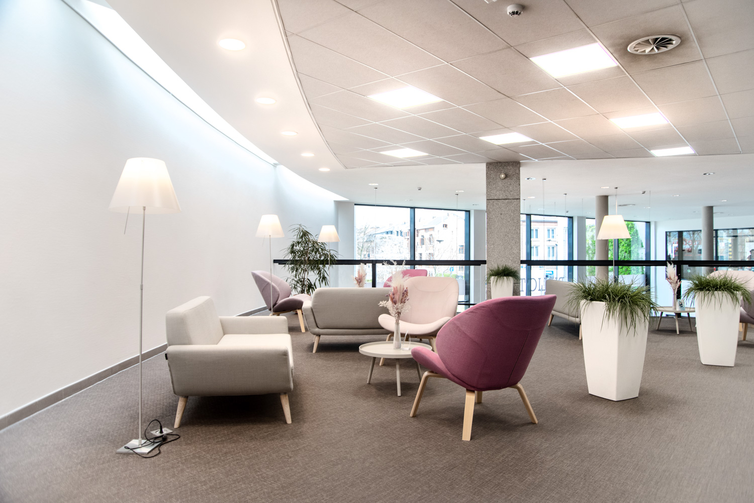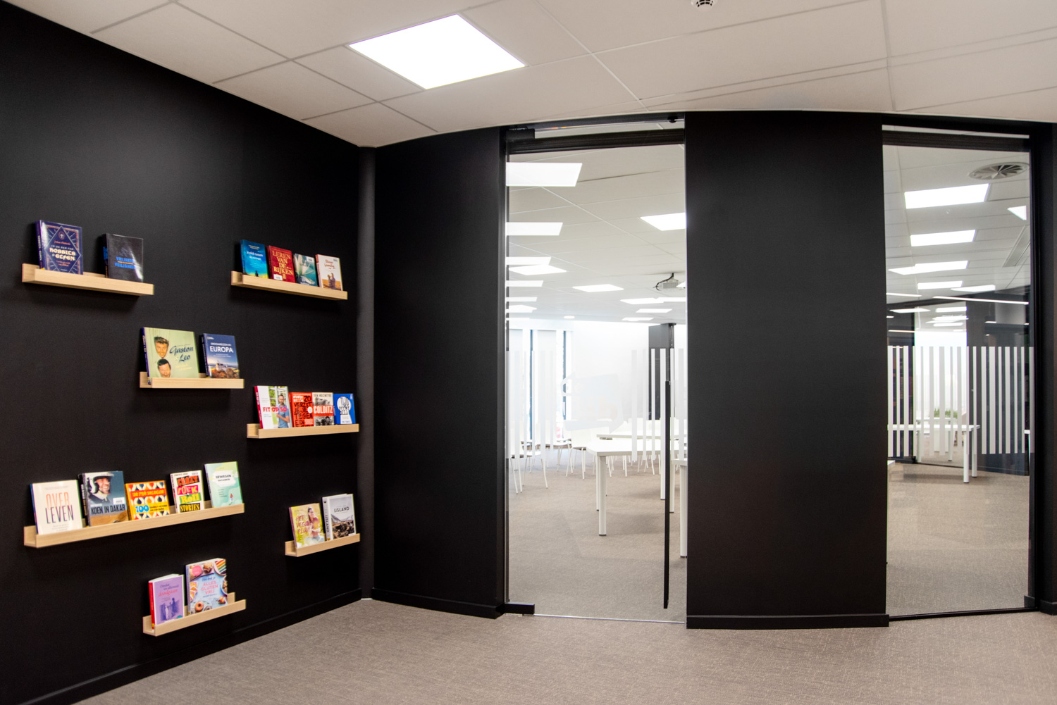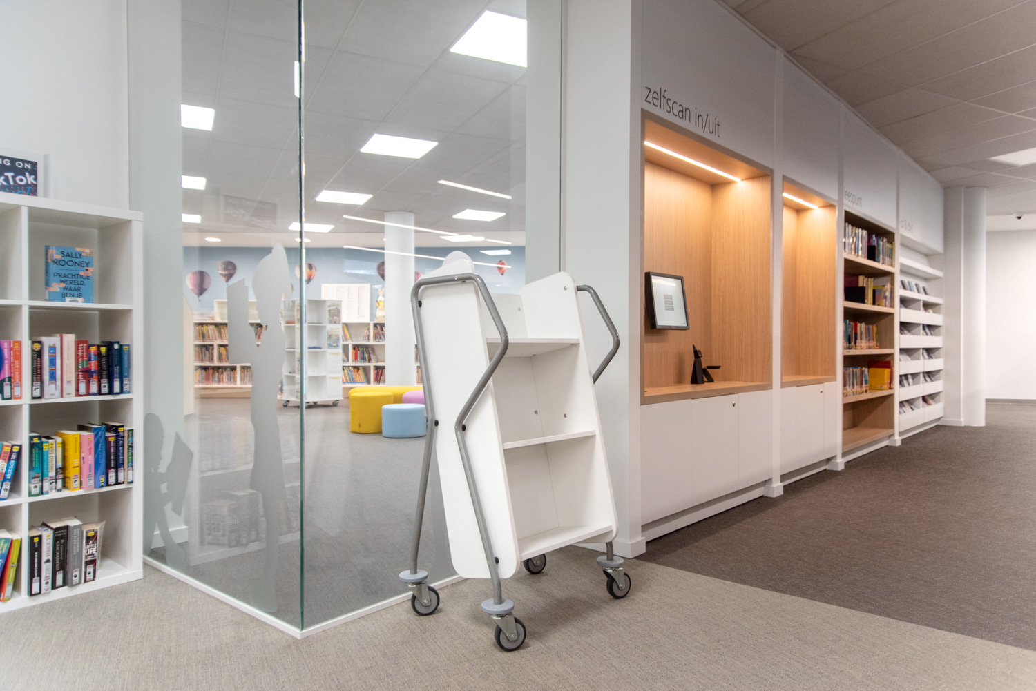 Besøgende kommer ikke kun til biblioteket for at låne bøger; de bruger også biblioteket til at studere i rolige omgivelser, læse avisen eller mødes over en snak. Derfor er der blevet installeret komfortable loungeområder. Nye materialer præsenteres ved indgangen samt på reolernes endegavle.