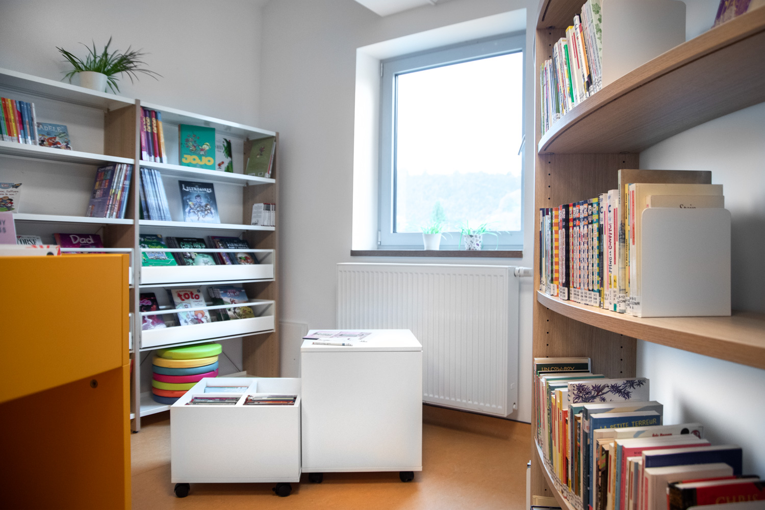 Efter oversvømmelserne i 2021, der ødelagde det gamle bibliotek, var planerne heldigvis allerede på plads for at flytte biblioteket til en nyopført skolebygning. I dag står biblioteket som et lyst, moderne rum, prydet med behagelige farver og runde møbler, der blødgør det strømlinede, lineære design.