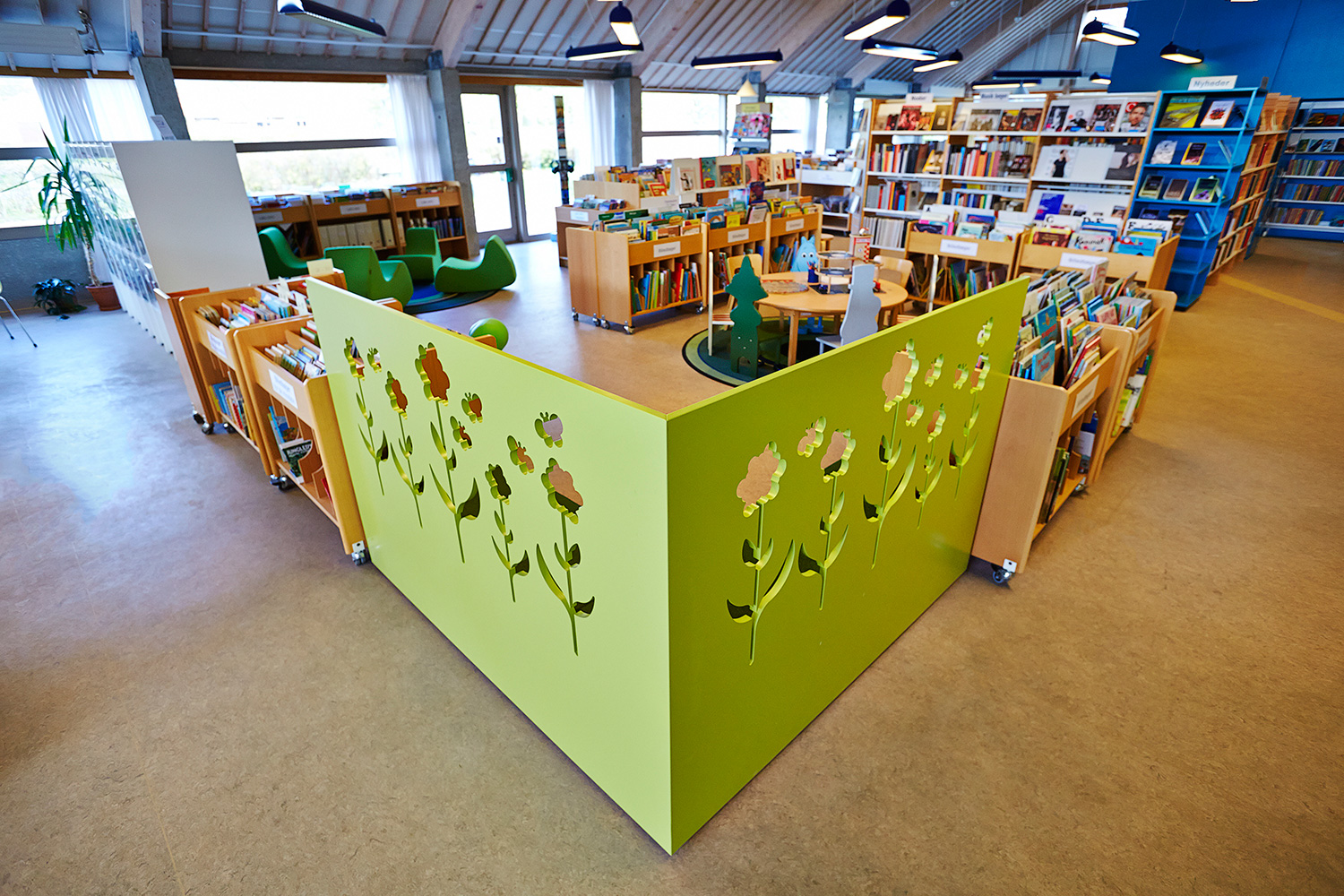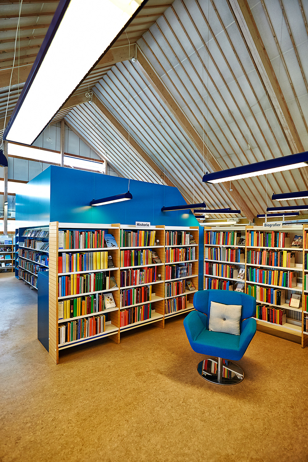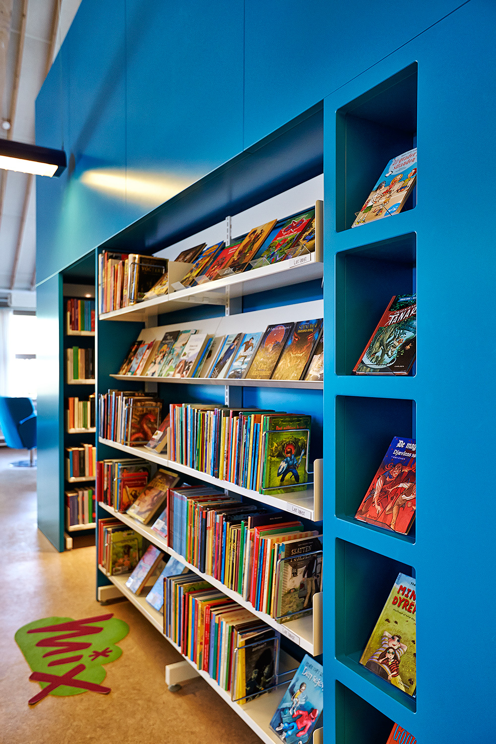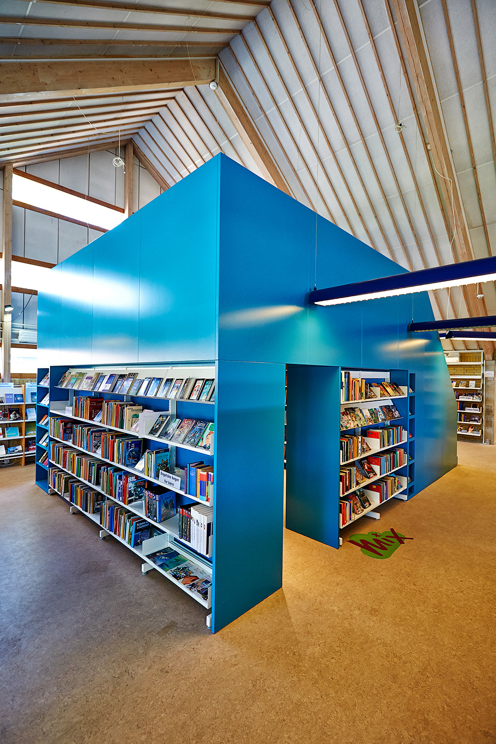 De fleste reoler er genbrug og som en del af den nye indretning har Lykke tegnet specialmøbler, som deler rummet op samt understreger og adskiller de forskellige materialegrupper.