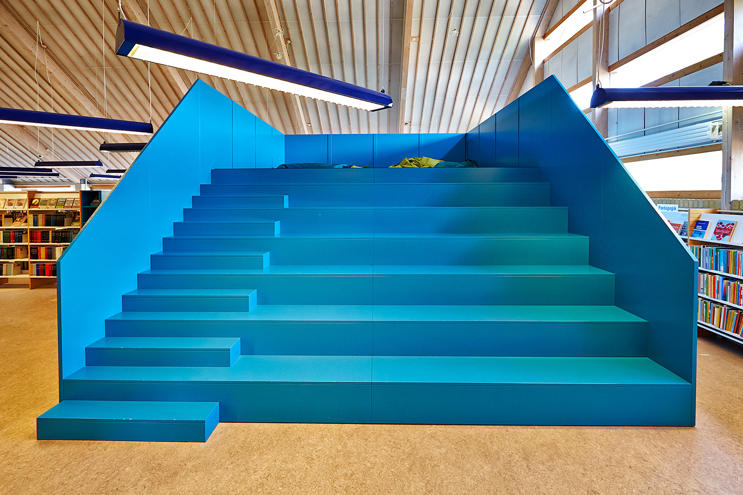 Et af disse er et flot og markant trappemøbel med flere funktioner. Møblet indeholder et rum, hvor man kan fordybe sig i en god bog, en bred sidde/læse-trappe, og en platform, hvor man kan slænge sig i en sækkestol. Der er reolnicher udvendig, så det samtidig er en slags bogtårn.
