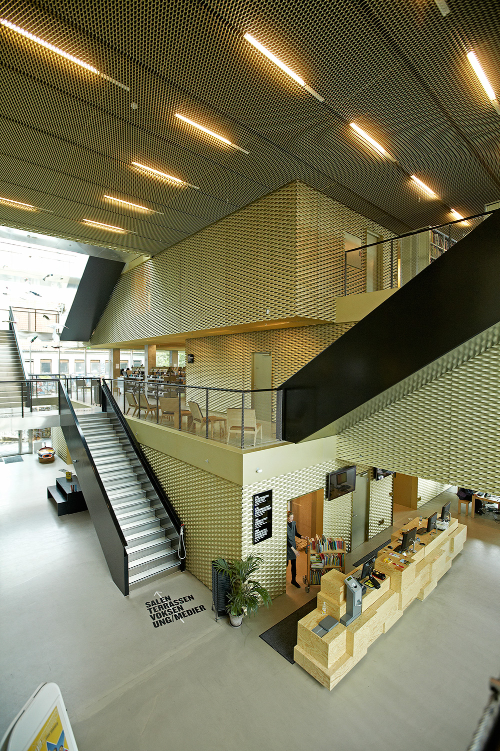 Stedet har sin egen sjæl, og arkitekterne og byplanlæggerne har både fanget og fornyet stedets essens. Gyldne, gennemhullede plader dækker facaden, og bygningen er lavet af fire blokke, som kan ses som fire bøger med forskelligt indhold.