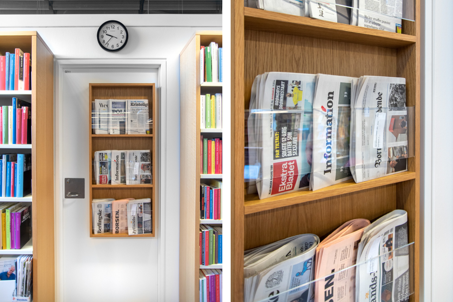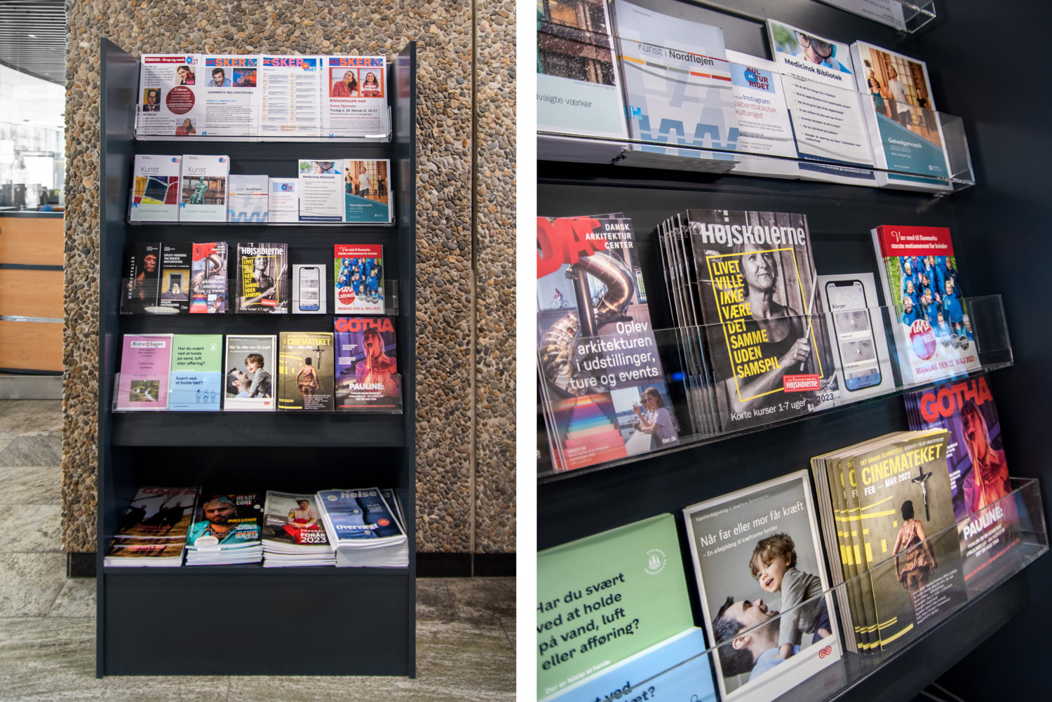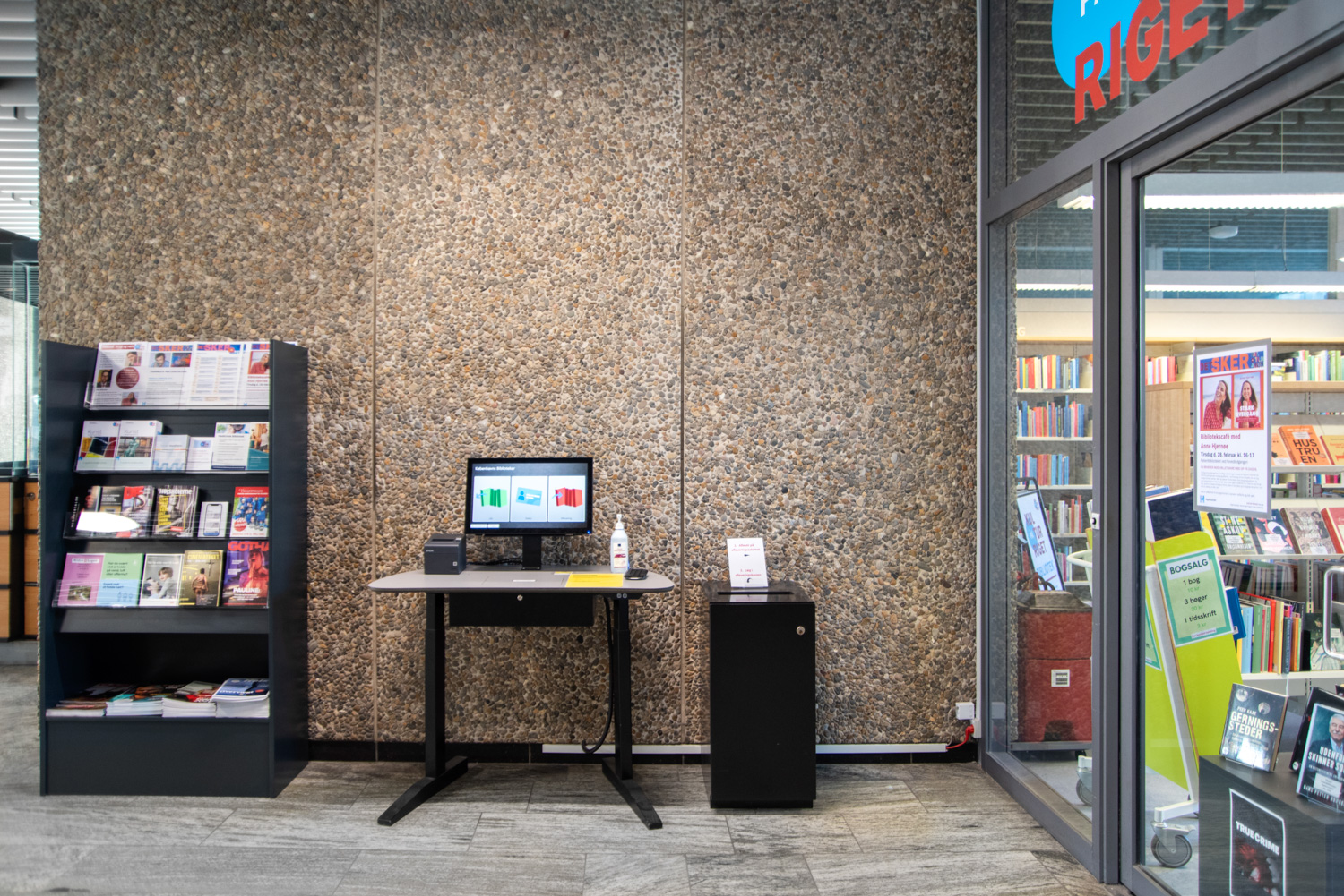 På biblioteket ses flotte udstillingshylder på reolernes gavle med spændende og iøjnefaldende læsning. Møbler tæller blandt andet Hay og Andersen Furniture samt specialdesignede avis- og brochureholdere.