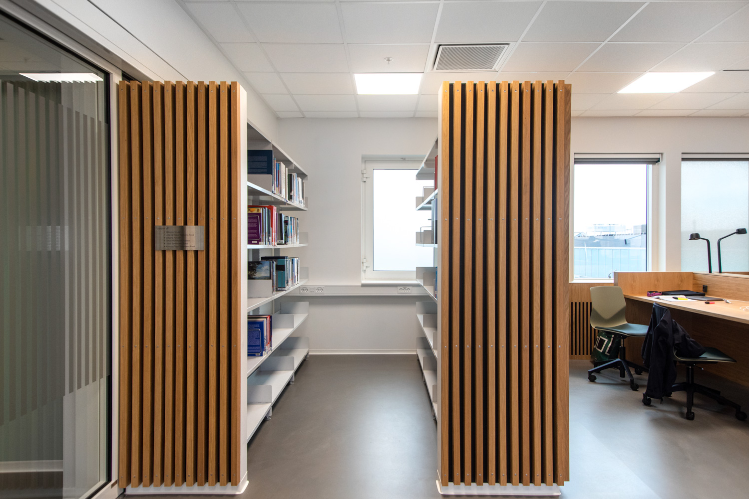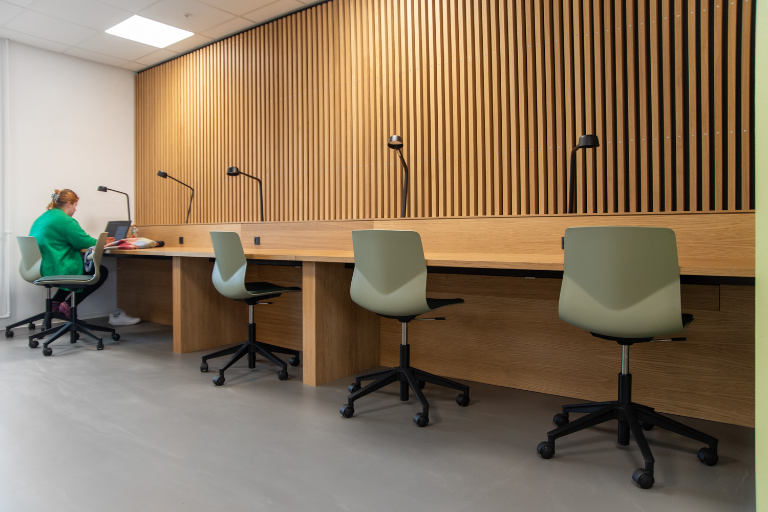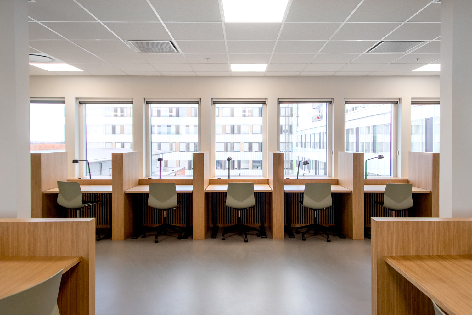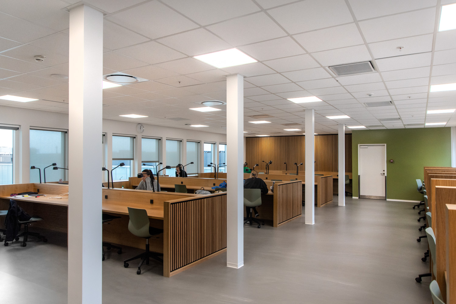 Afskærmningsvæggene mellem bordene giver plads til ro og fordybelse. De studerende kan sidde og arbejde i et behageligt og afslappet miljø, hvor både de varme materialer og det naturlige lys bliver bragt flot i spil.