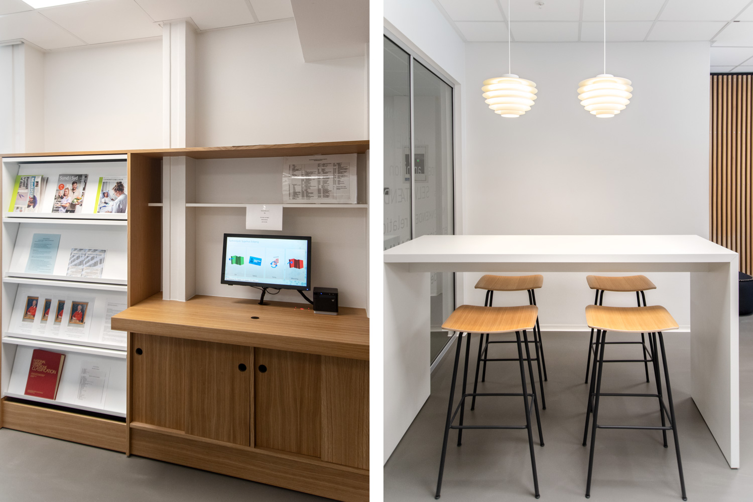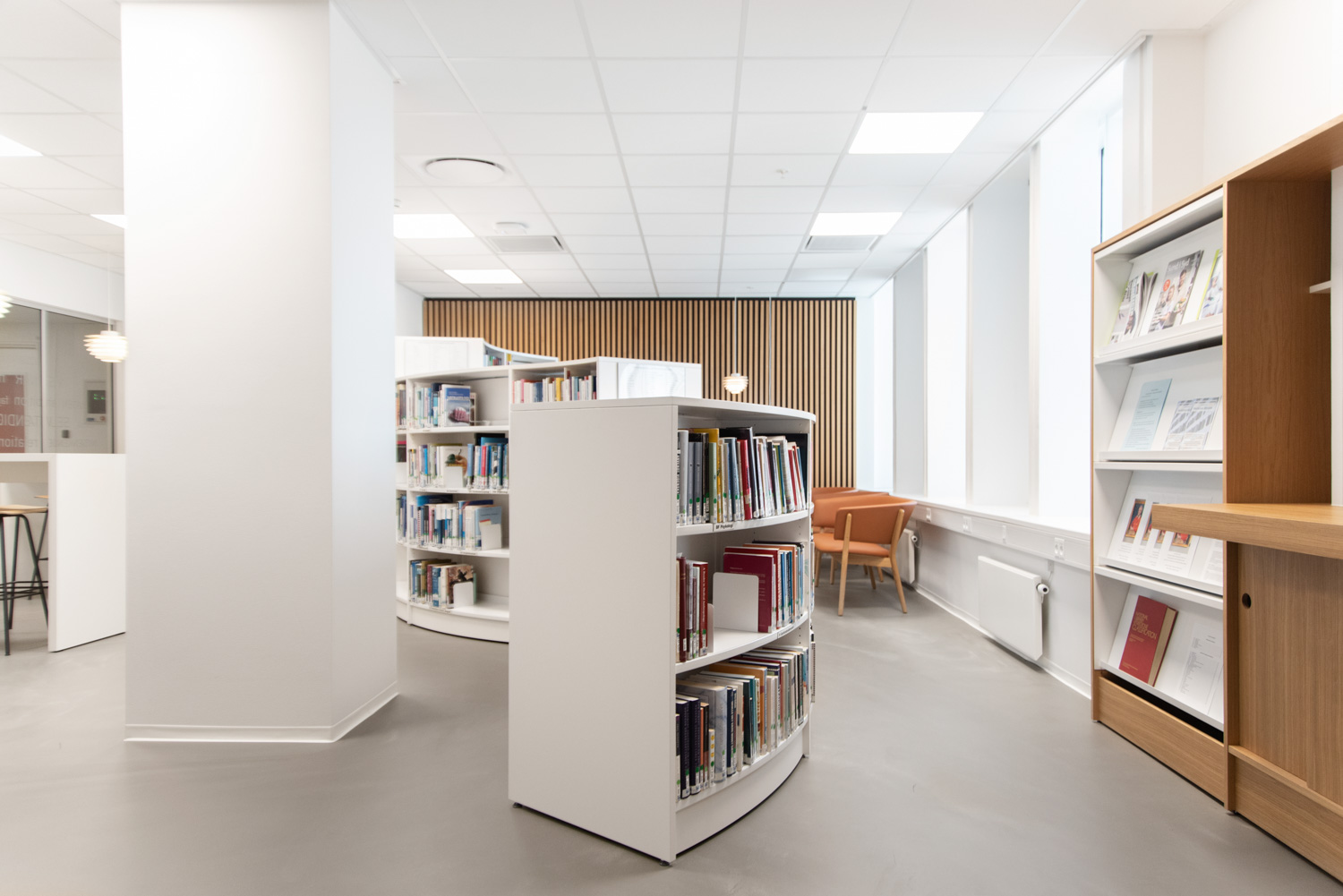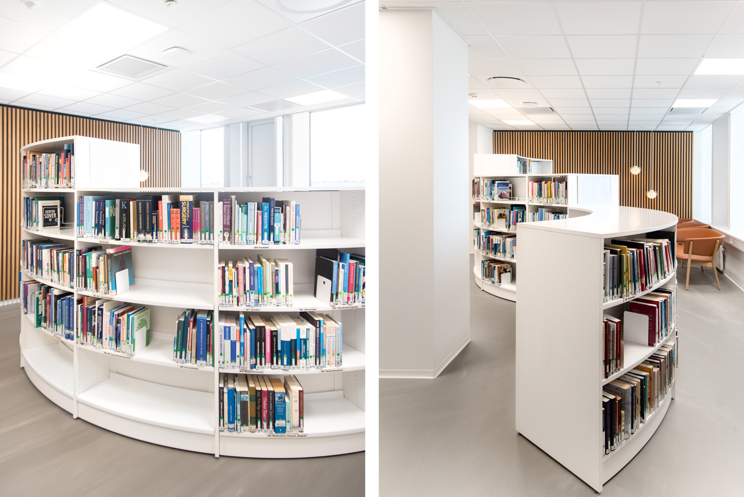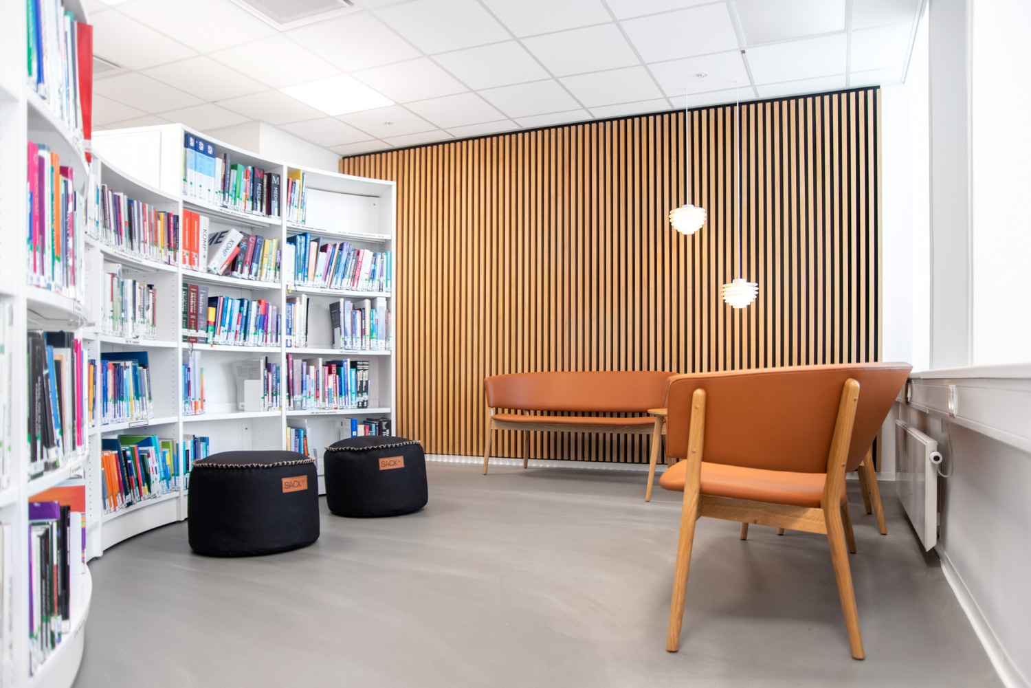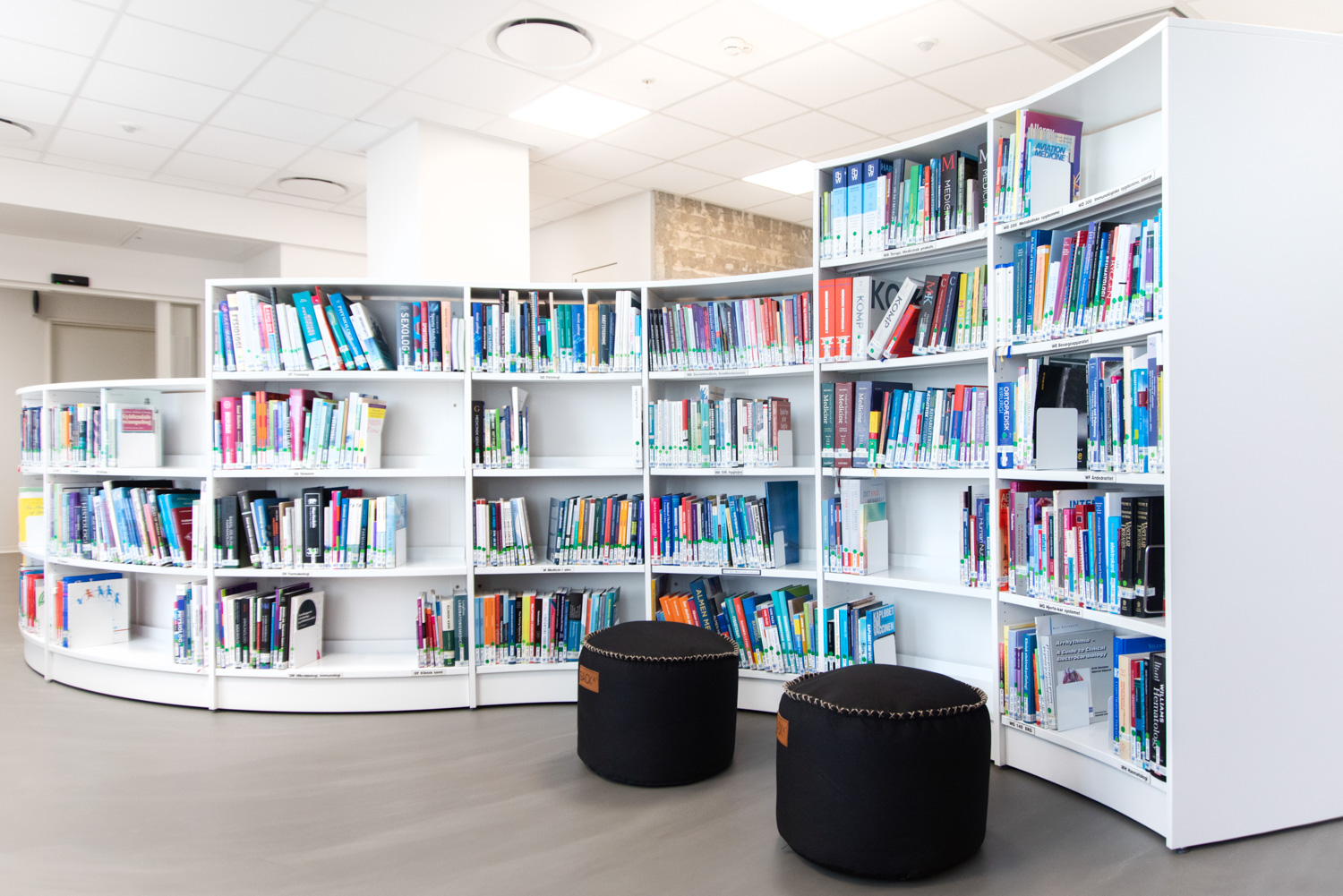 Træmaterialet skaber en varm kontrast til glas- og betonbygningen. Med årene vil træet få noget patina, der er med til at skabe et ”ægte” og særpræget udtryk. Vi har leveret de runde, slangeformede reoler samt store egetræsstudieborde, hvor de studerende kan sidde sammen eller hver for sig. Alle ledninger er blevet flot skjult inde i bordene.