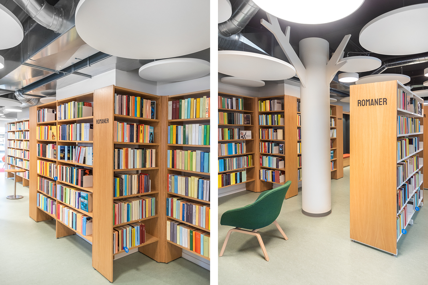 Eksisterende stålreoler er nu pakket ind i trægavle, der sammen med nye træreoler i egefiner skaber en fin harmoni og giver varme til biblioteksrummet.