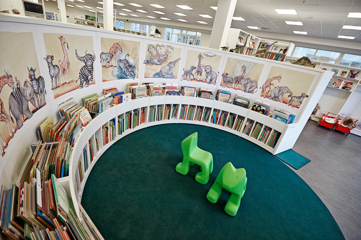 oplev børneafdelingen med dens runde reoler og illustrationer skabt af en lokal kunstner!