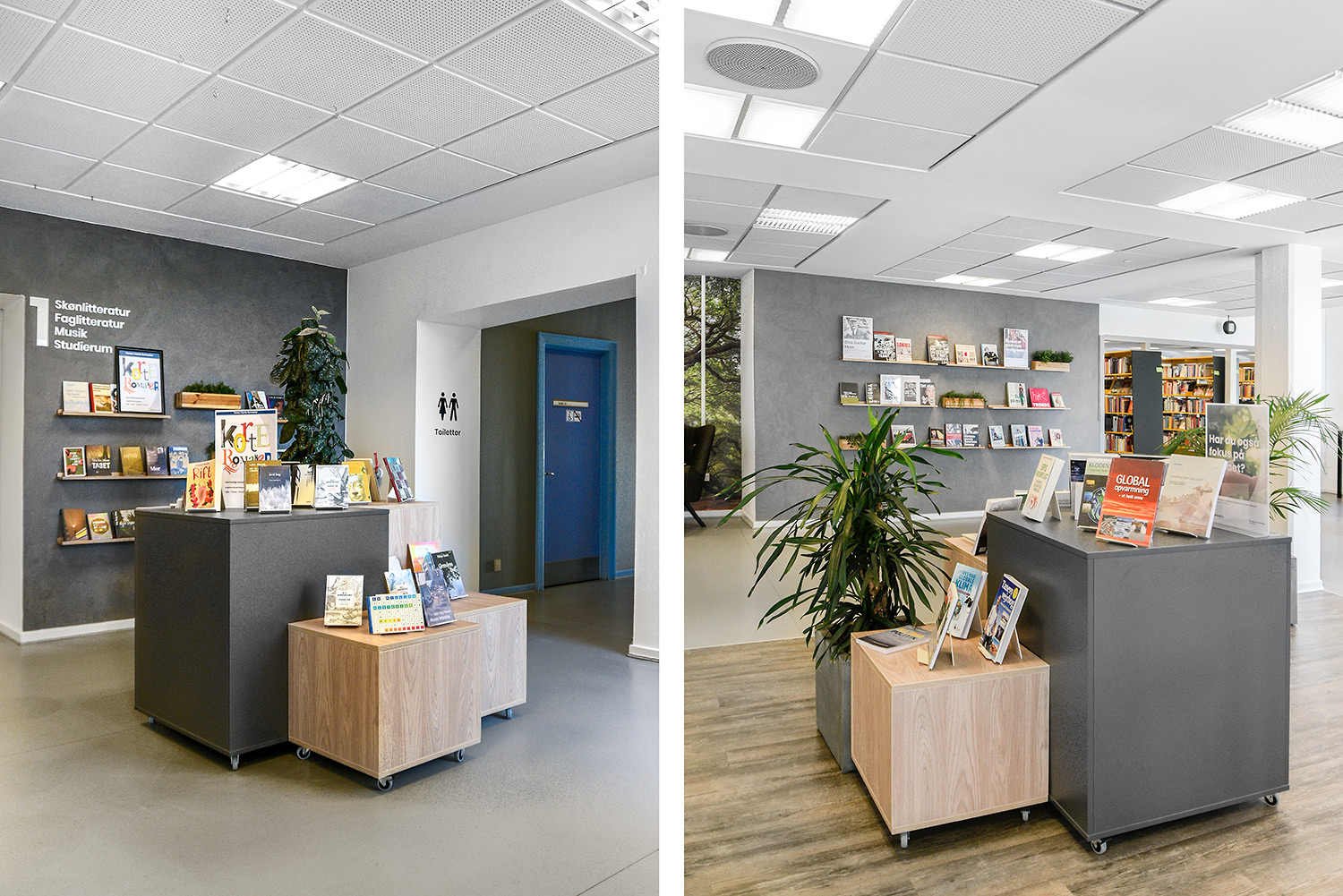 Nu er de gule reoler blevet en del af en helhed, der skaber en moderne fortælling om natur på en stilren og meget unik måde. De gule reoler er blevet en styrke fremfor en nødvendighed. Helheden er opnået ved at lave en stærk farvepalette, hvor de gule, grå og grønne farver sammen med træmaterialerne har et flot samspil, og er med til at understrege naturen i indretningen.
