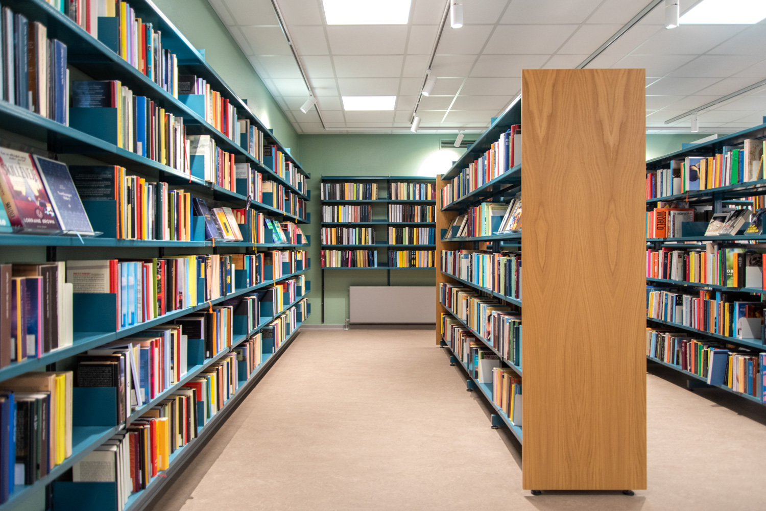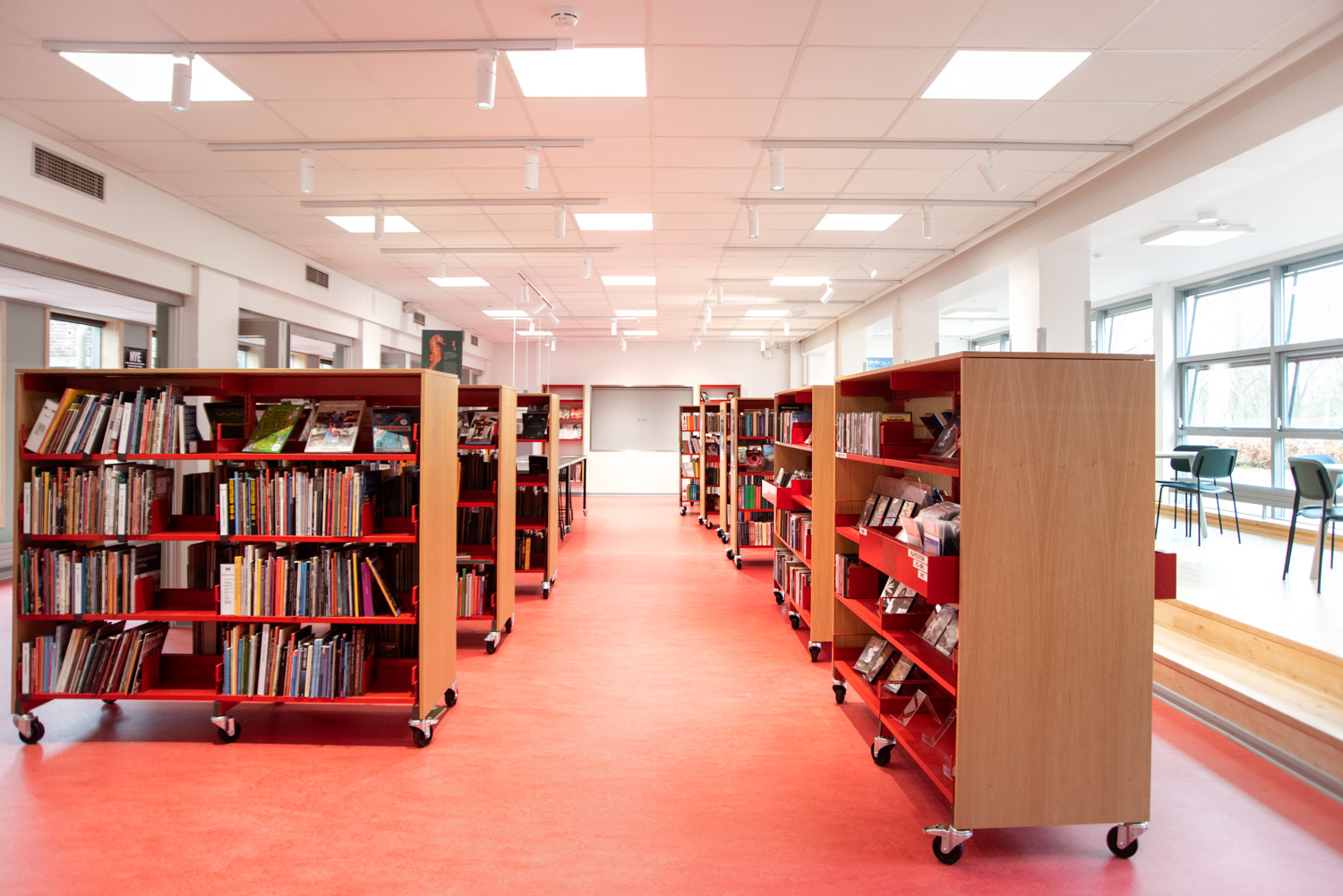 Biblioteket bygger på værdier om genbrug og bæredygtighed, hvorfor bygningen er renoveret og de gamle reoler genbrugt. En bygningsarkitekt har stået for renoveringen, mens Lammhults Biblioteksdesign har stået for vægfarver og indretning. Ved at modernisere reolerne med nye gavle og placere de blå og røde reoler strategisk i forhold til de nye røde gulve, står biblioteket i dag med en imødekommende og unik farvesætning.