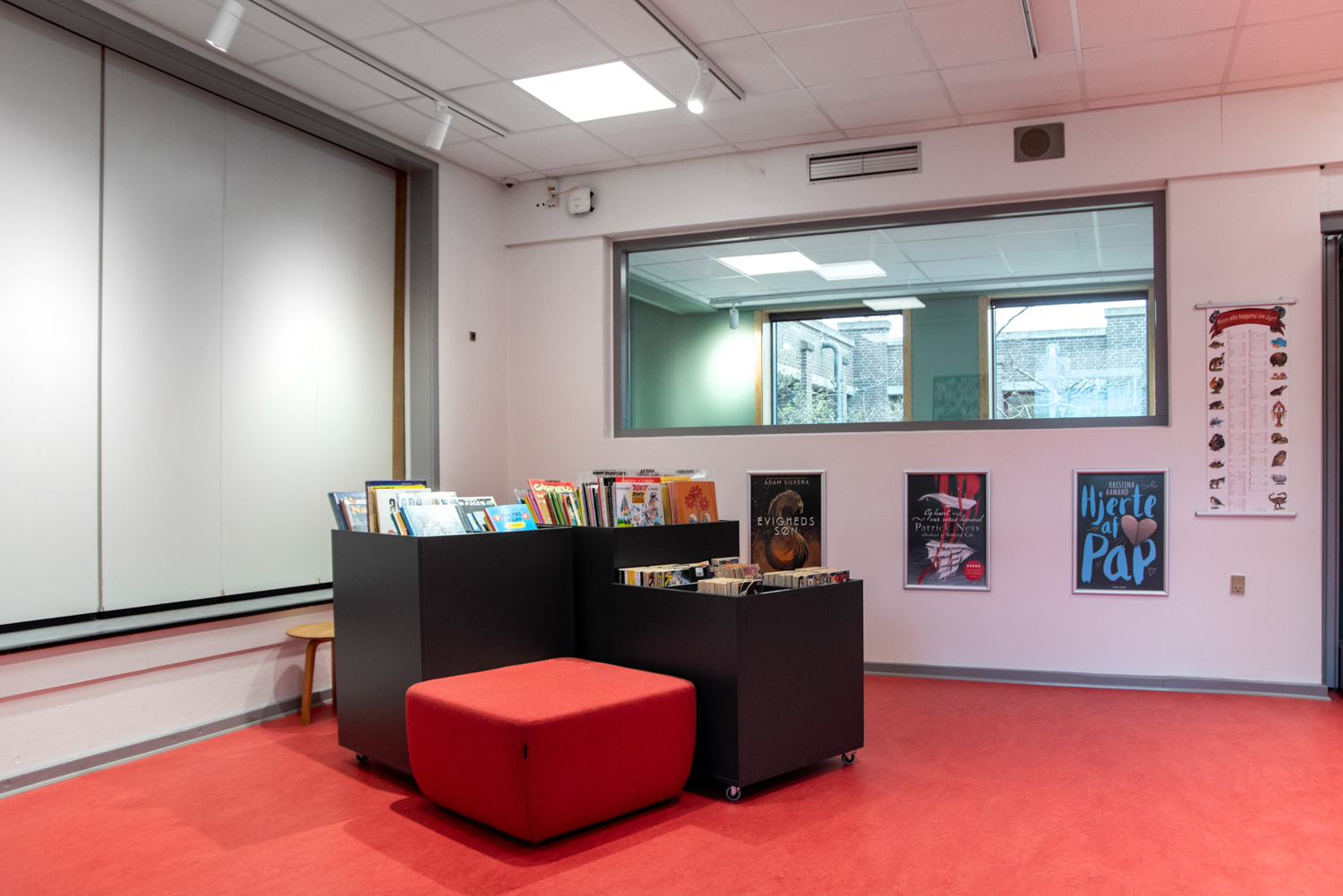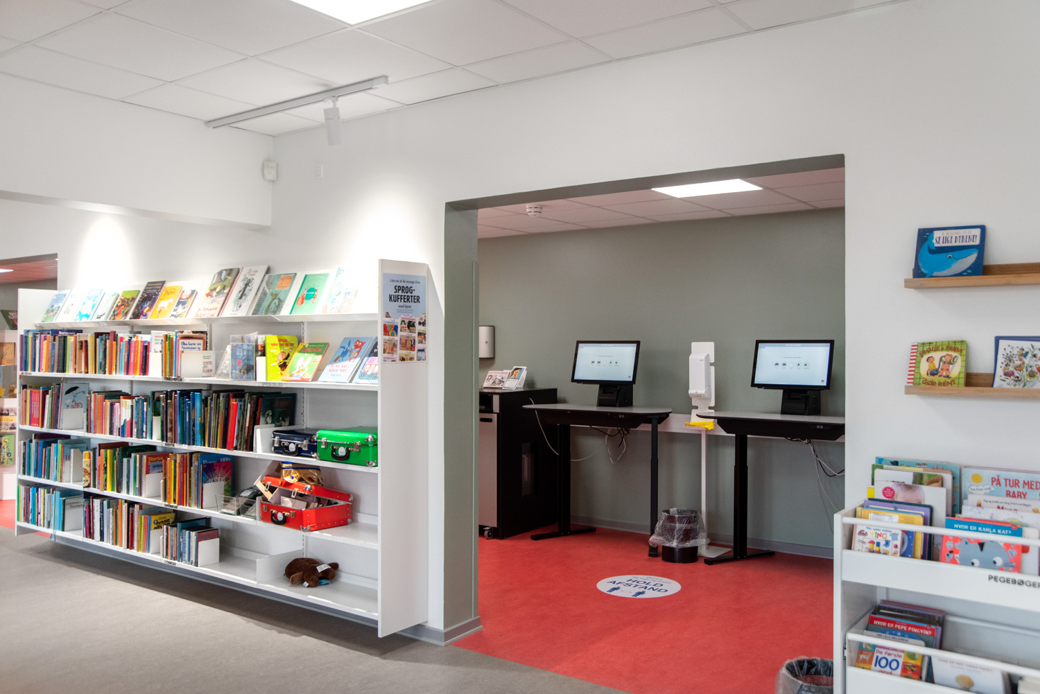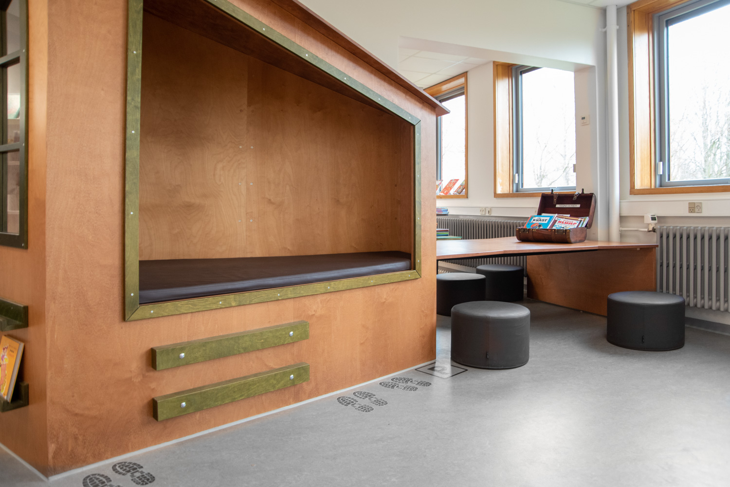 Indgangen er indrettet som et livligt loungeområde med vægfolier, der tydeligt viser, hvor du skal hen, hvis du skal til træning eller på biblioteket. I børneafdelingen giver en vægfolie følelsen af at træde ind i skoven. Dette bliver suppleret af små siddetræstammer samt en hytte, hvor børnene kan sidde i rolige omgivelser og fordybe sig i bøgernes verden.