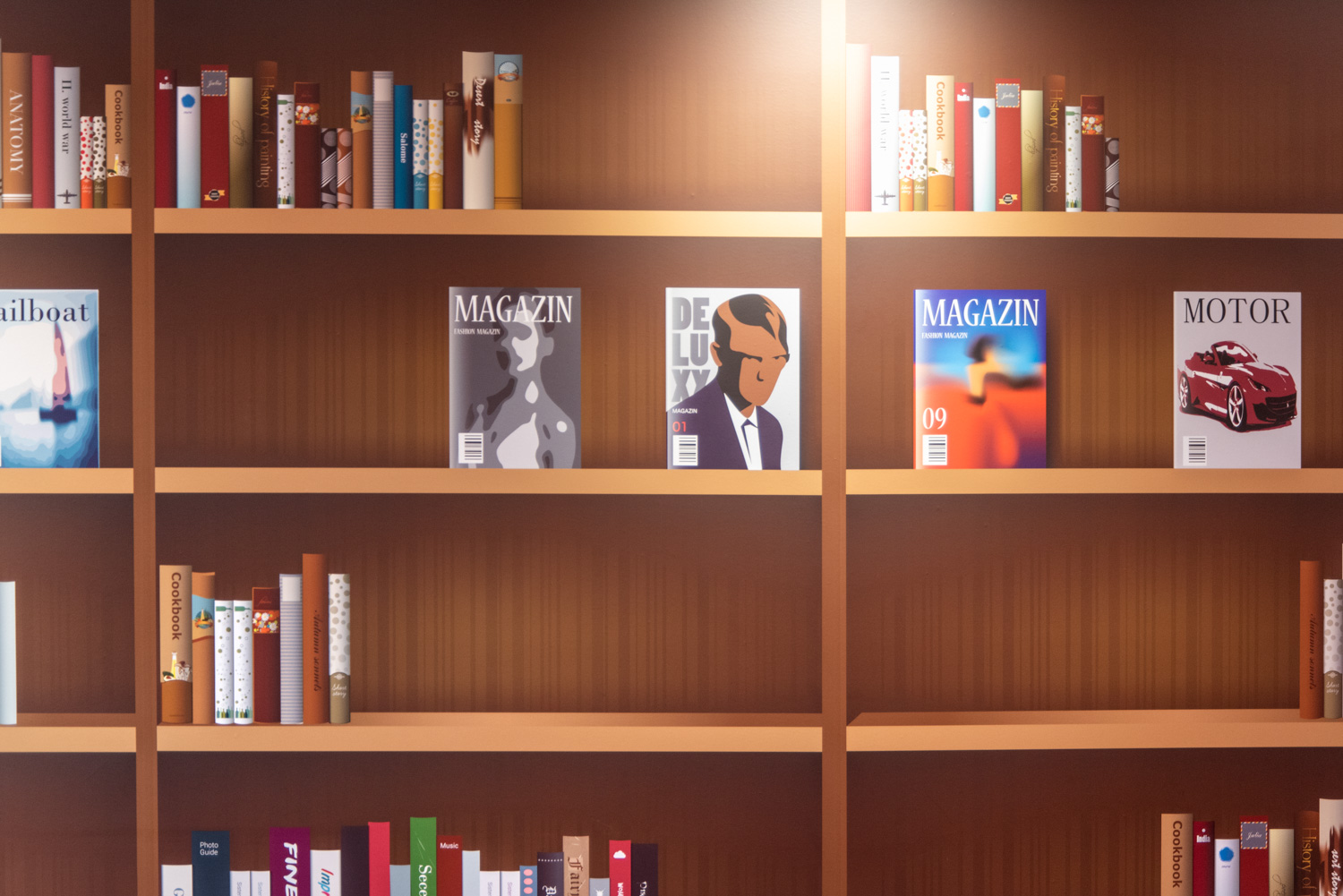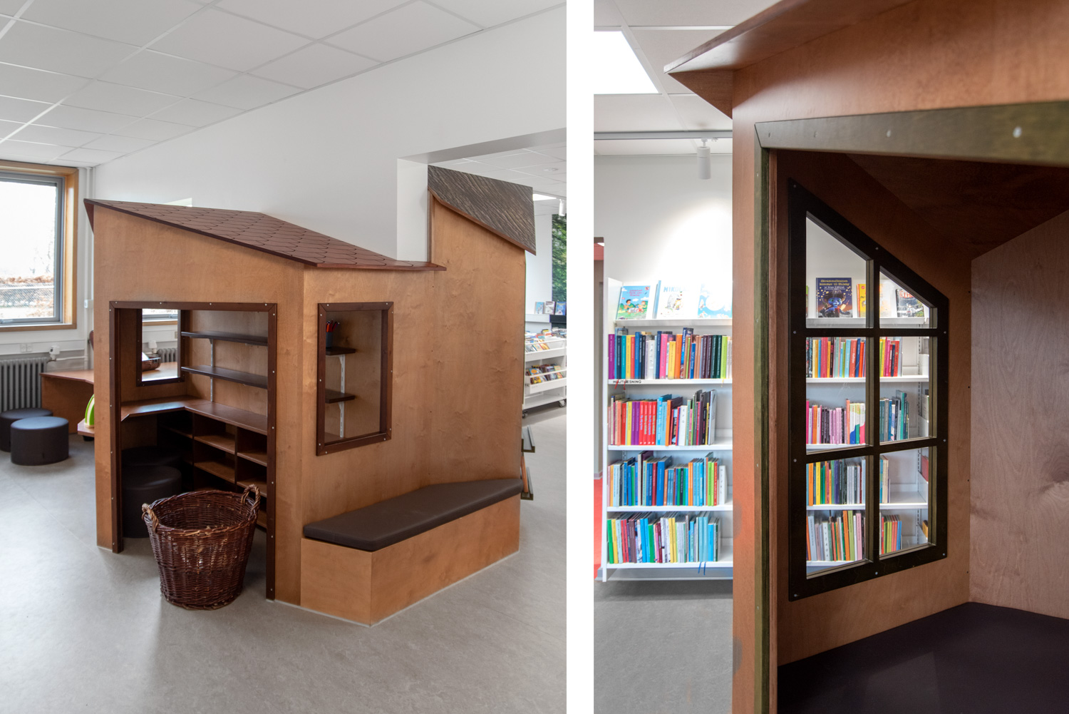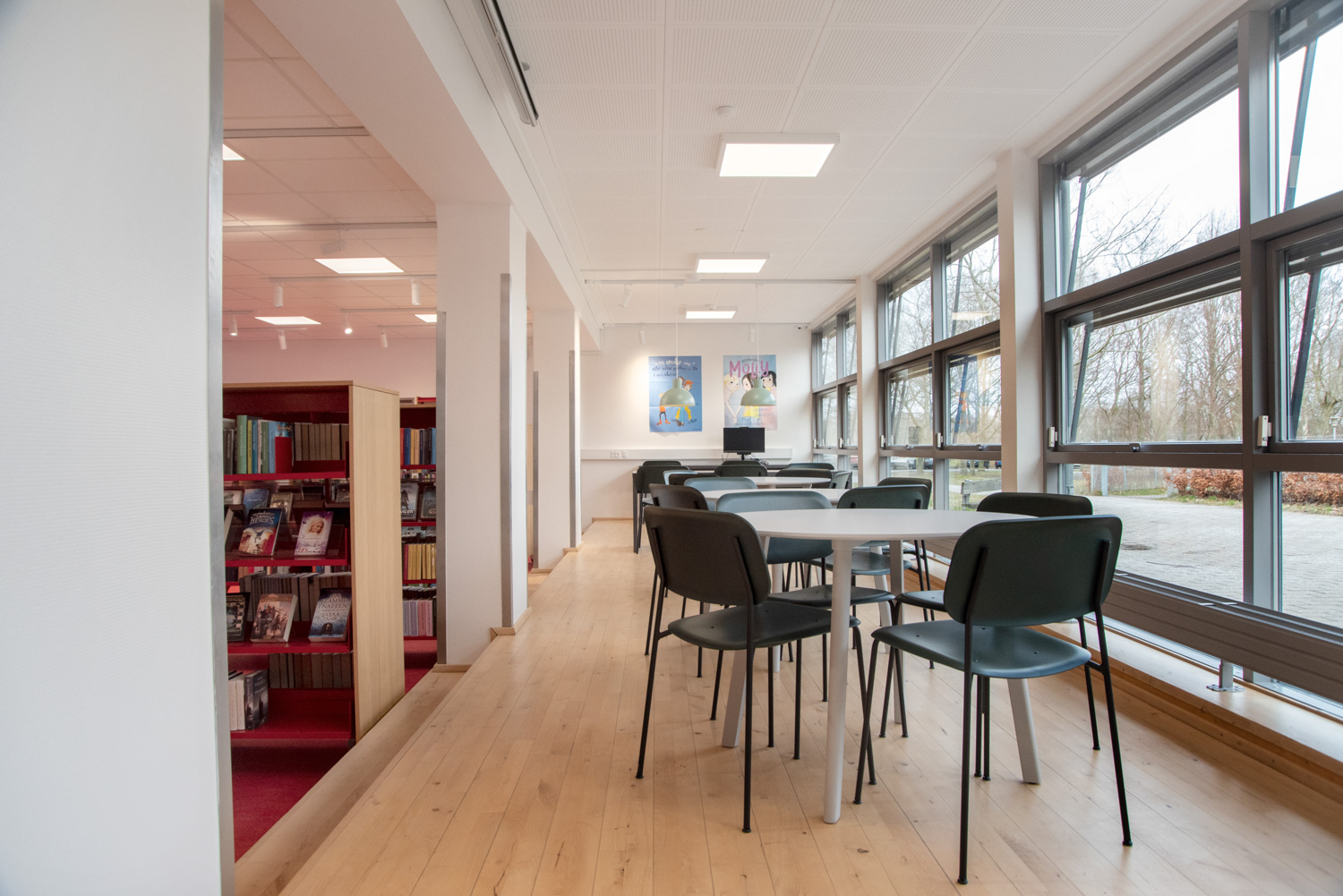 Indgangen er indrettet som et livligt loungeområde med vægfolier, der tydeligt viser, hvor du skal hen, hvis du skal til træning eller på biblioteket. I børneafdelingen giver en vægfolie følelsen af at træde ind i skoven. Dette bliver suppleret af små siddetræstammer samt en hytte, hvor børnene kan sidde i rolige omgivelser og fordybe sig i bøgernes verden.