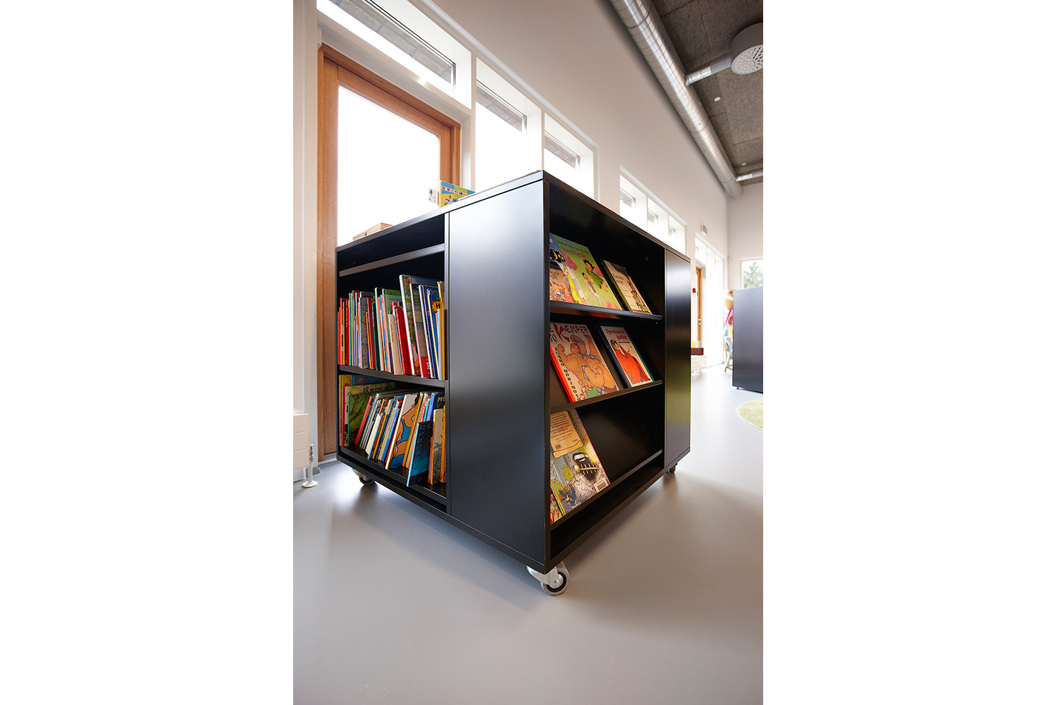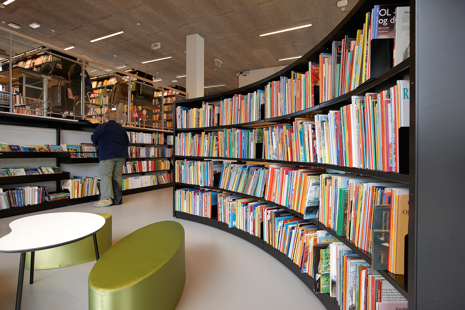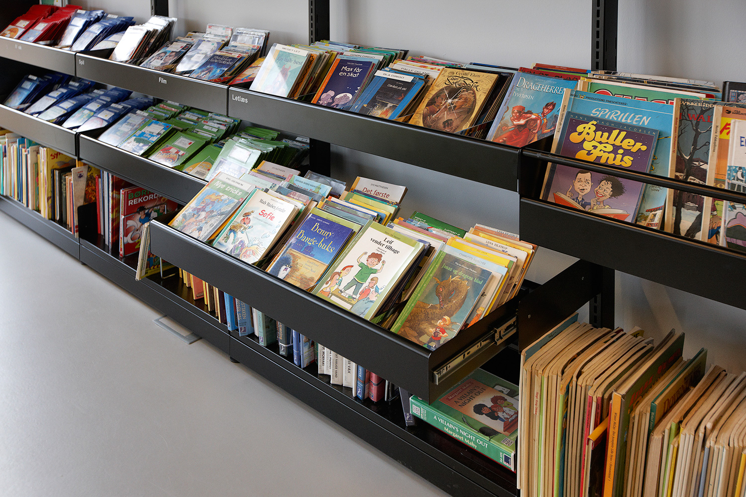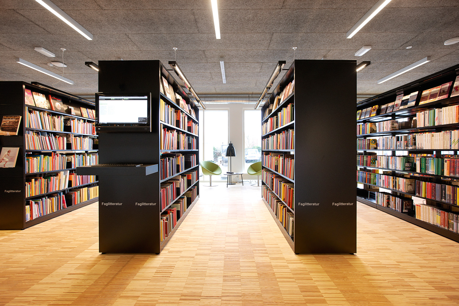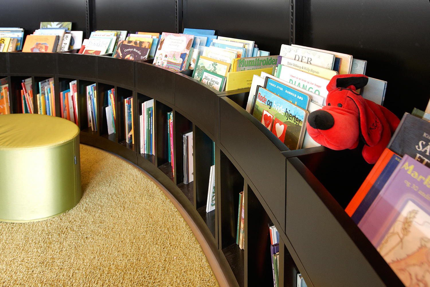 Biblioteket er indrettet med 60/30 klassisk stålreol med London endegavle og baldakiner samt indbygget Book Big lys. Der findes også specialindrettede løsninger som integrerede borde for enden af reolerne samt den runde billedbogskrybbe i børnezonen.
