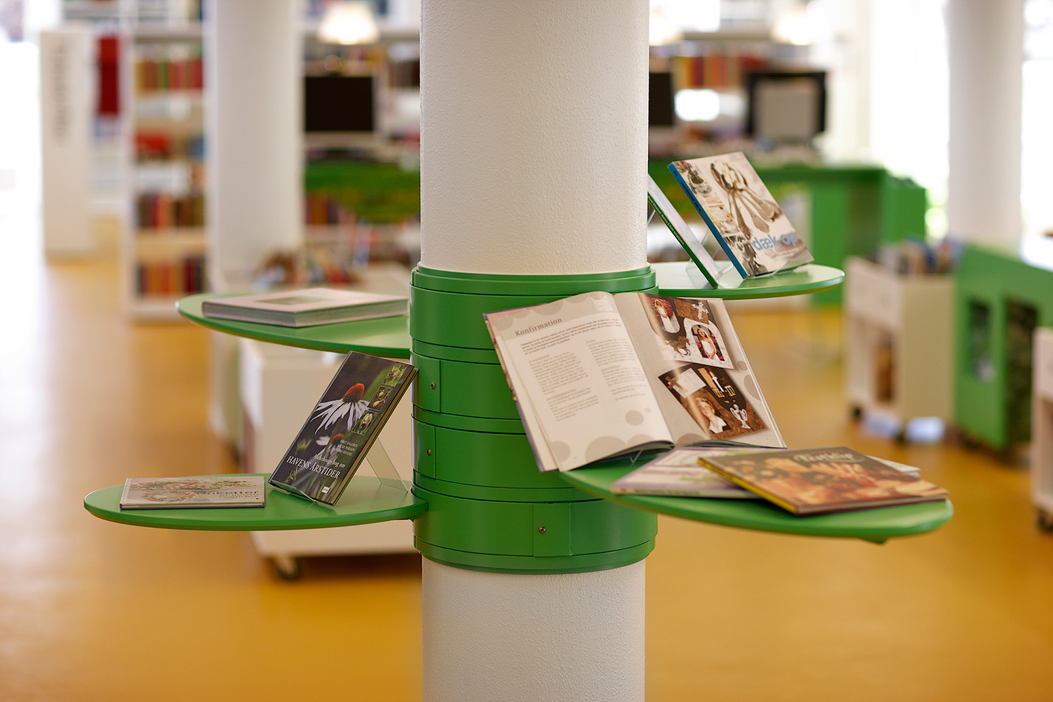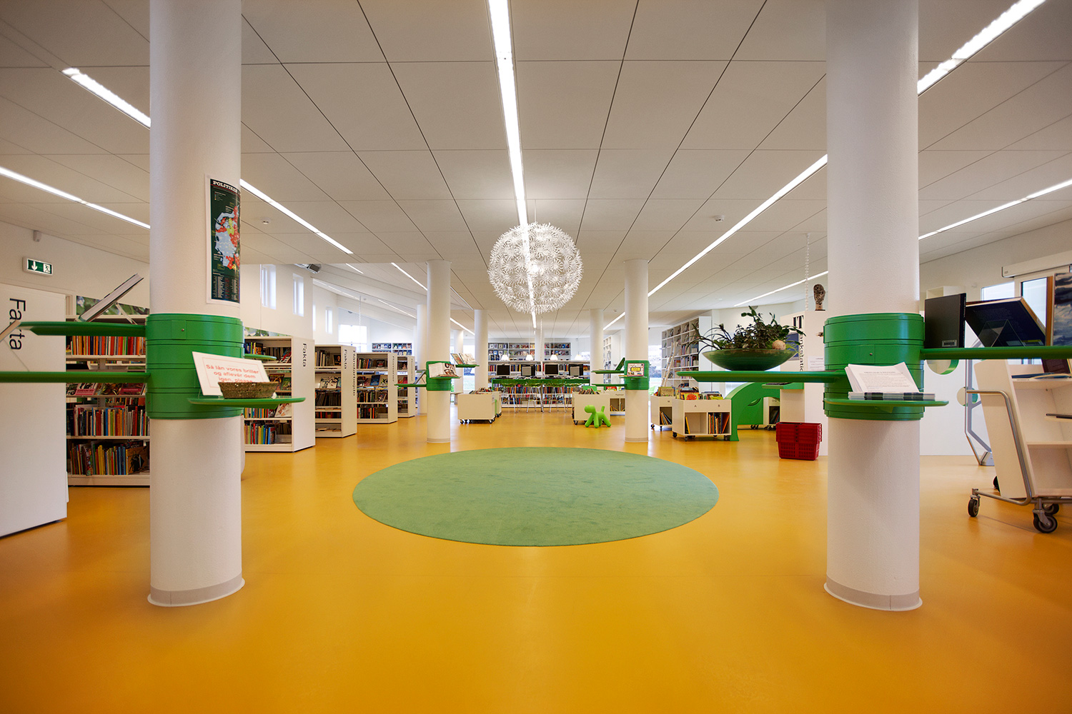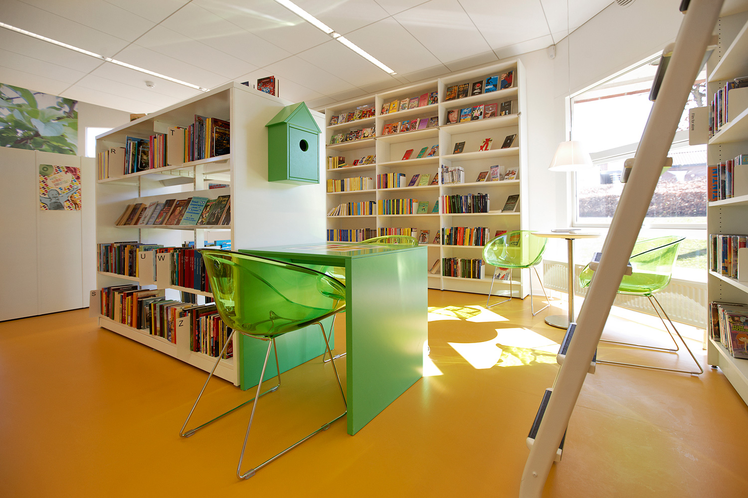 Som baggrund for den grønne linie er biblioteket udstyret med hvidlakerede 60/30 klassisk stålreoler og møbler i lyse, klare farver.