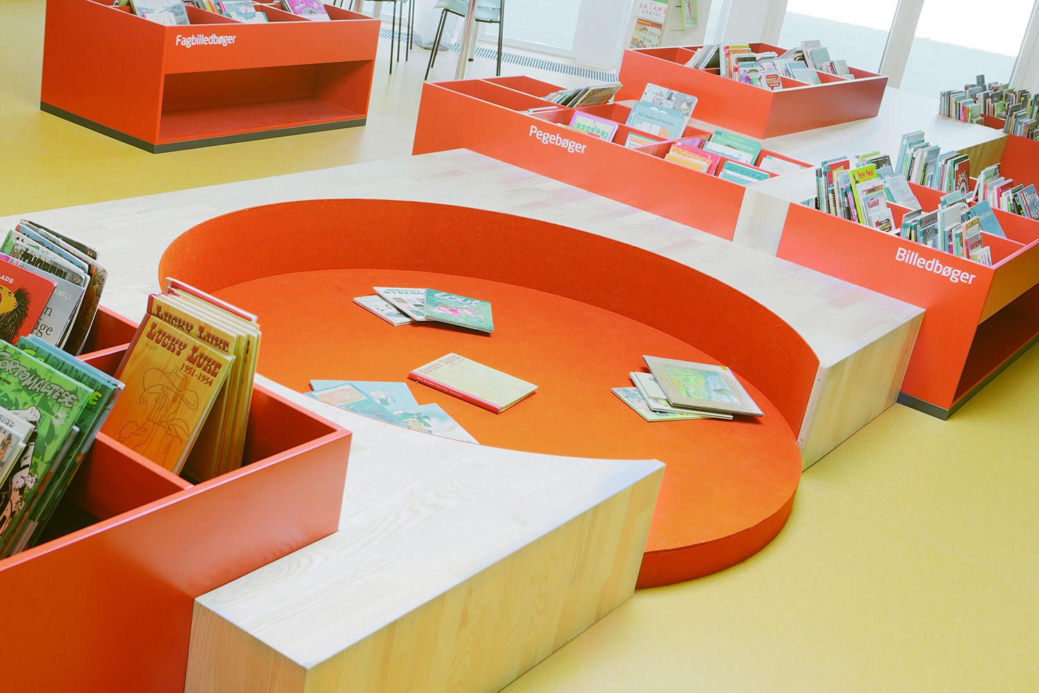 I børneafdelingen findes et specialtegnet stort lege-siddemøbel med indbyggede krybber til udstilling af billedbøger og væghængte reoler i forskudte højder giver dynamik til rummet. Mobile orange udstillingsmoduler er placeret i reolerne for at skabe opmærksomhed om udvalgte emner eller for at danne mindre specialudstillinger.