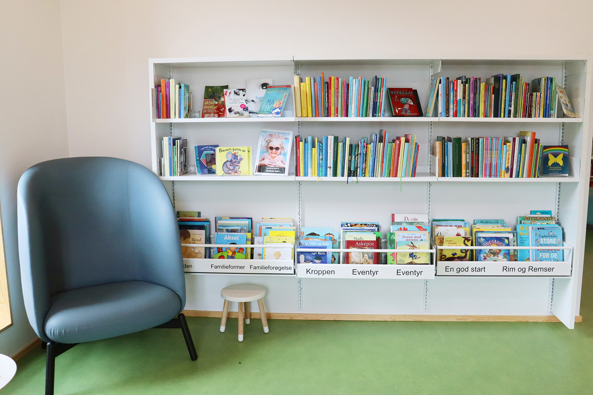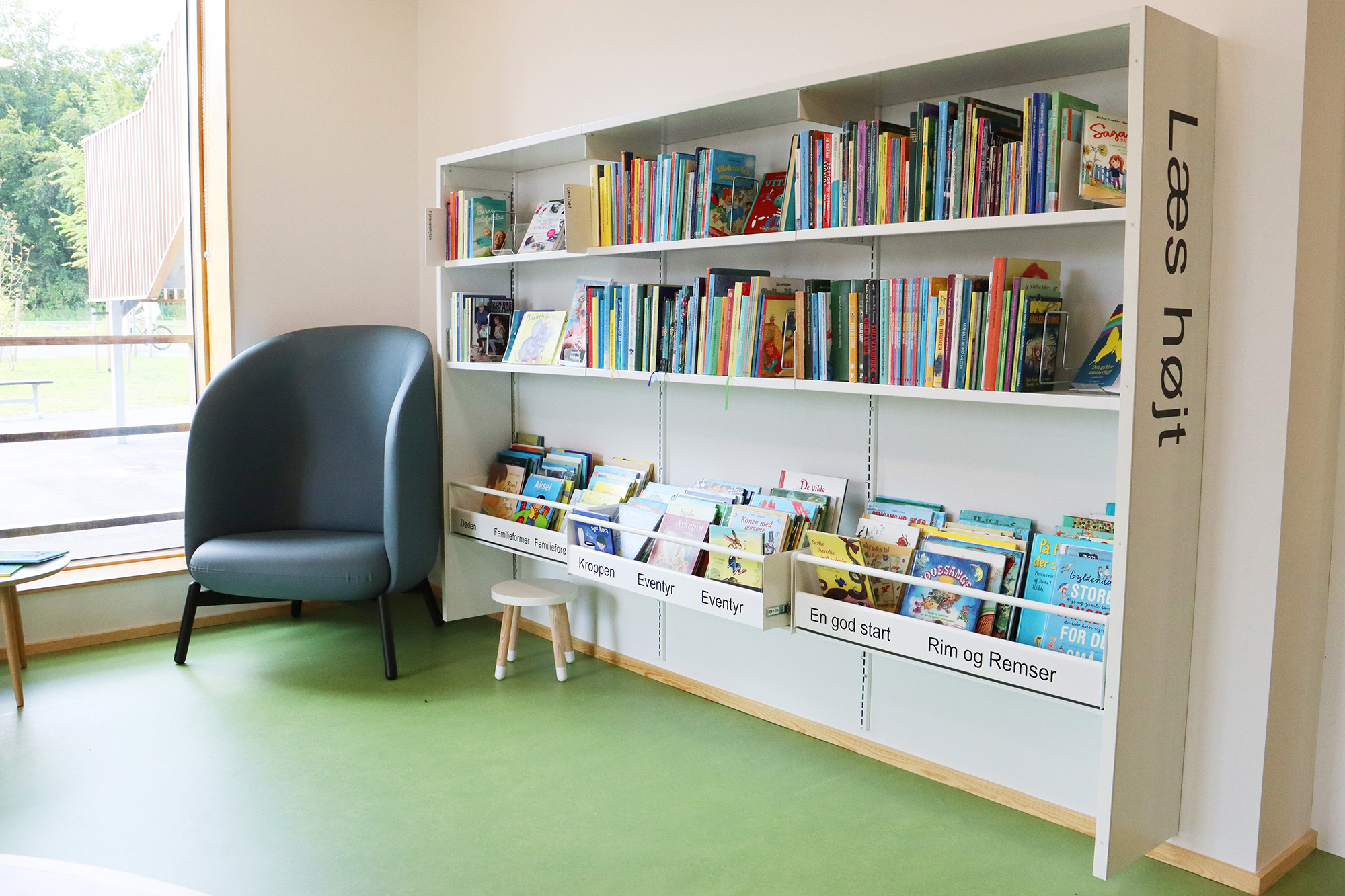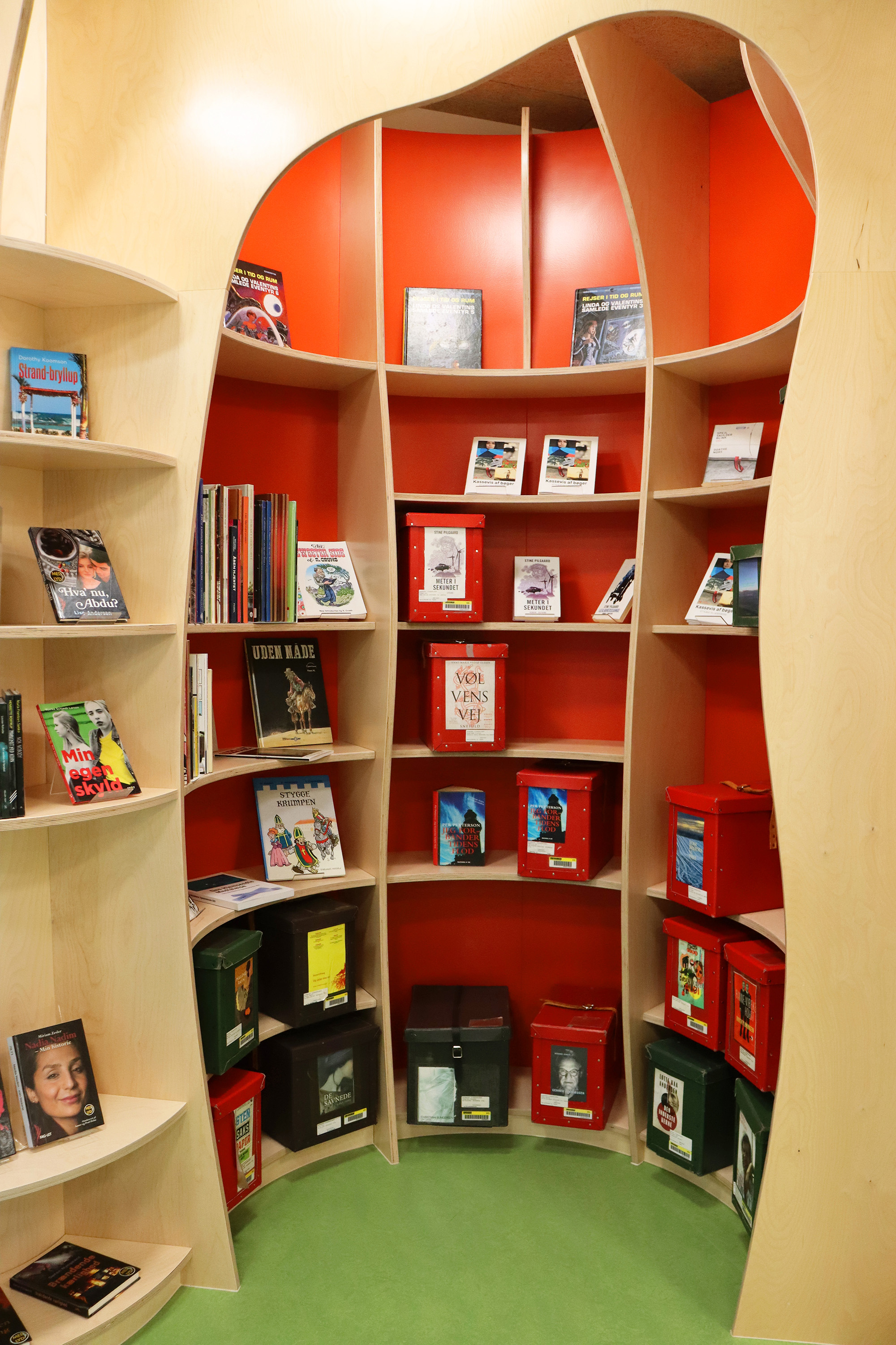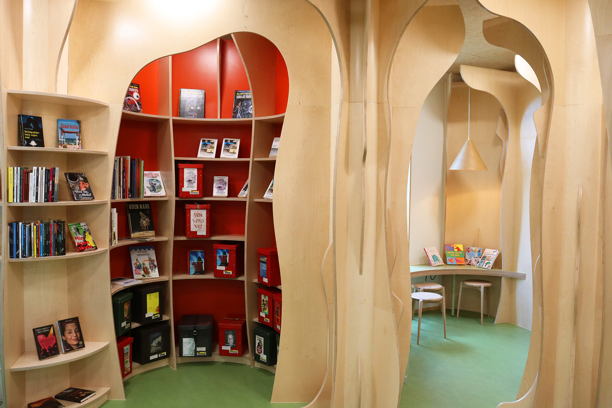 ”Biblioteket er tæt på hjerterummet for hele bygningen og bliver brugt mere, fordi det er en del af en større bygning. Det er – og skal være – børnene, der fylder meget, men der skal stadig være plads til alle. Vi arbejder meget med biblioteket som et organisk rum, der skal kunne tilbyde noget ekstra og overraskende. Det synes vi, i høj grad er lykkes,” fortæller bibliotekar Frederik Christian Nielsen.